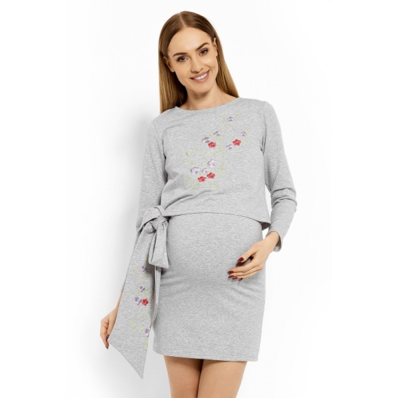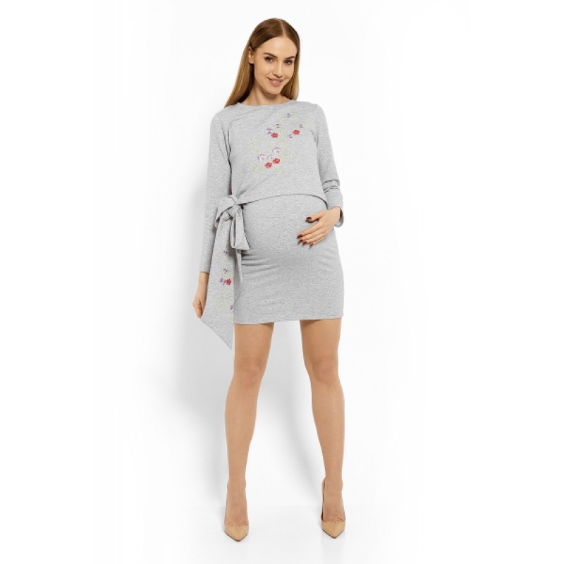 Elegantné tehotenské šaty, tunika s výšivkou a stuhou, L/XL- jasno sivý (dojčiace)