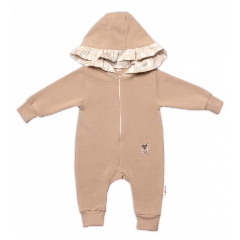Baby Nellys Teplákový overal s kapucňou a volánikom, New Bunny - cappuccino, veľ. 68