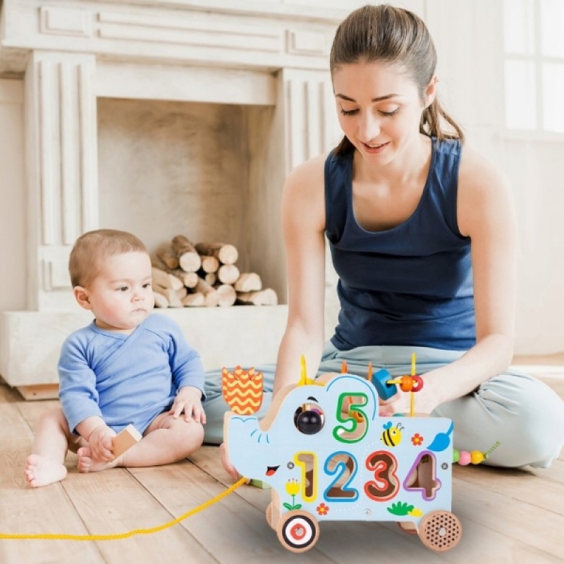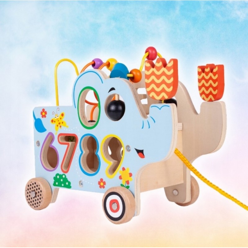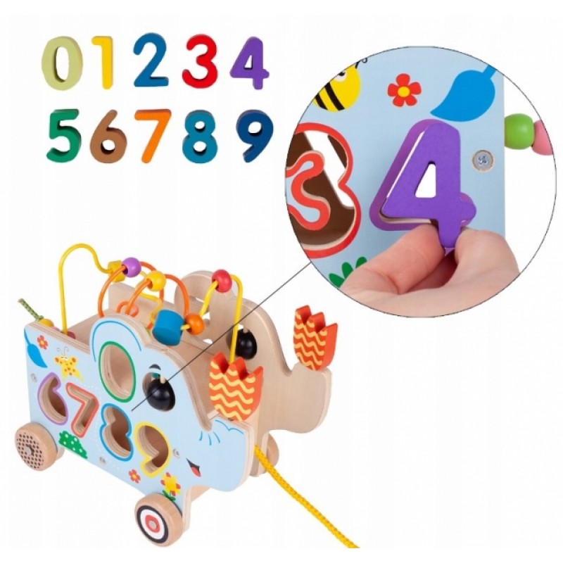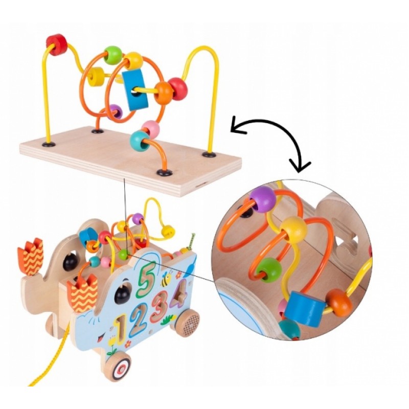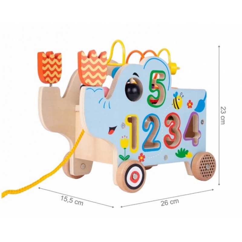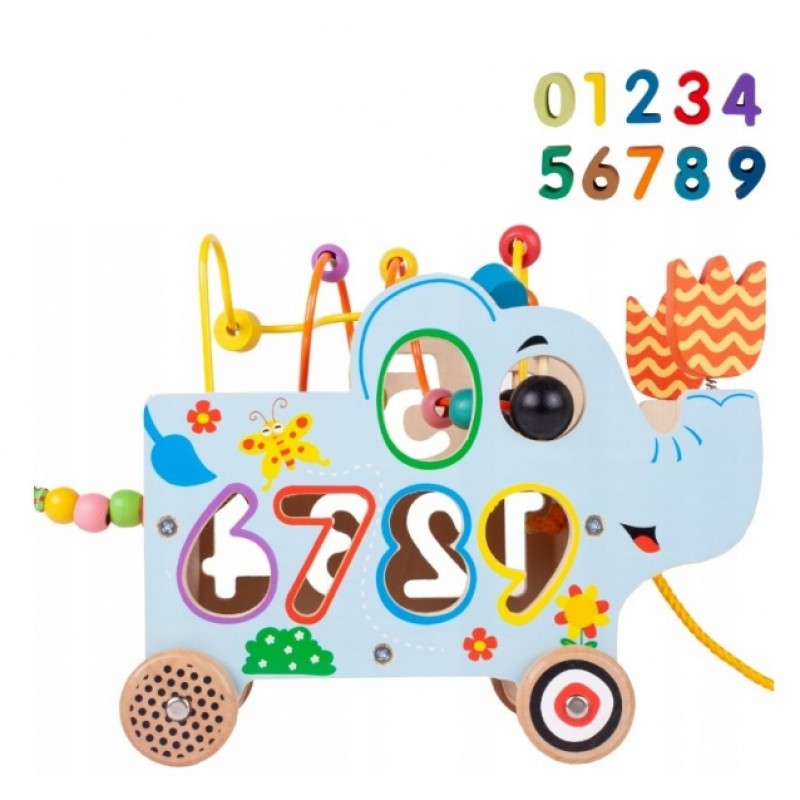 Tulimi Edukačný drevený slon s kolieskami, labyrintom a číslami