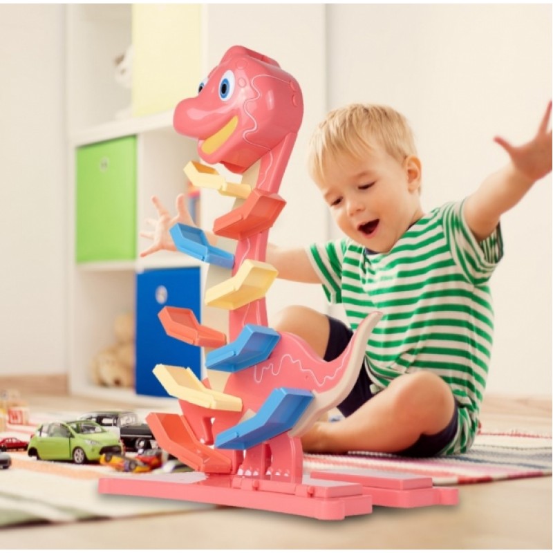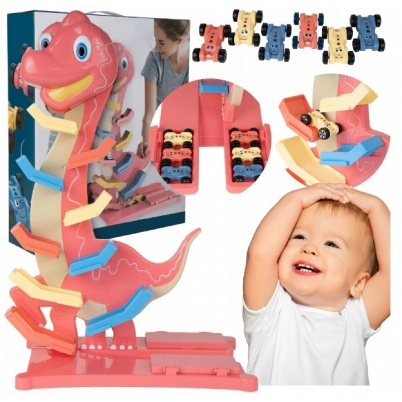 Veselá hrajúca autodráha/šmykľavka Dino Tulimi + 6 autíčok, oranžová