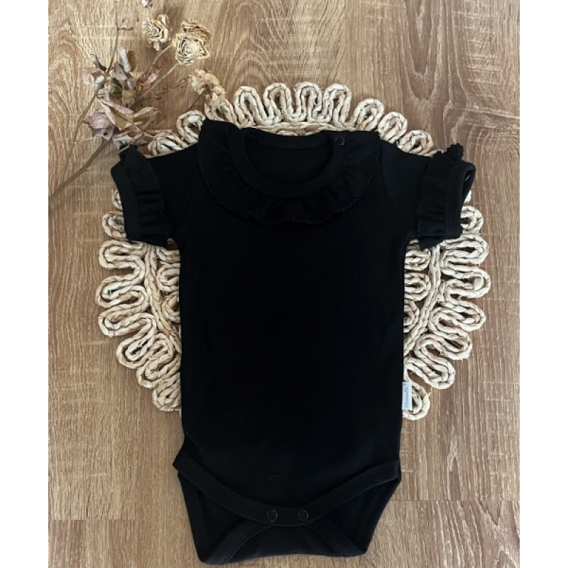 Detské body, kr. rukáv Mamatti, zap. pri krku, Baby Mouse - čierne s volánikmi, veľ. 98