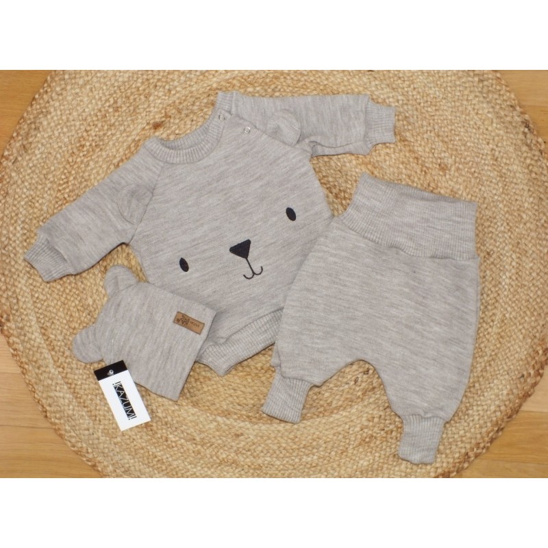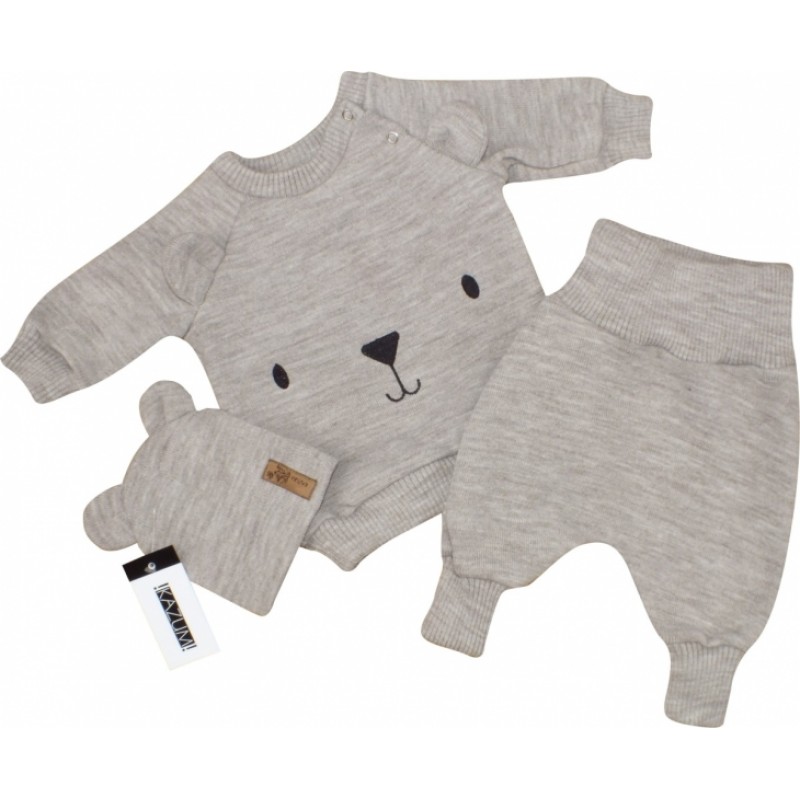 Pletená dojčenská sada 3D Medvedík, svetrík, tepláčiky + čiapočka Kazum, béžová, veľ. 80