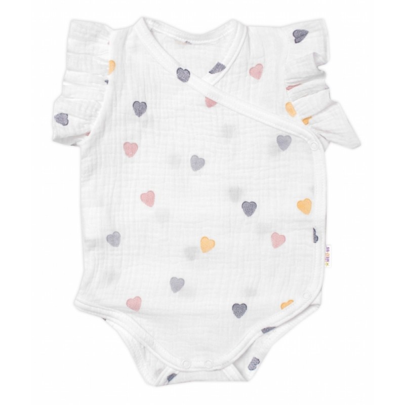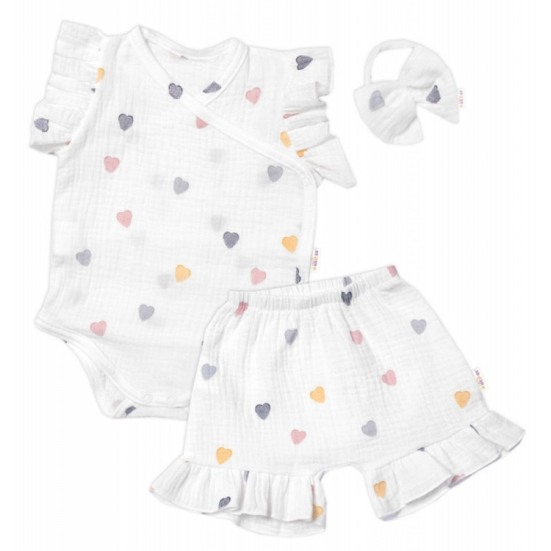 Zavinovacie body, kraťasky + čelenka, mušelín, Srdiečko, Baby Nellys, smotanové, veľ. 86