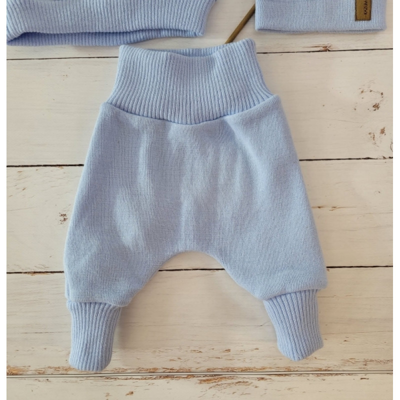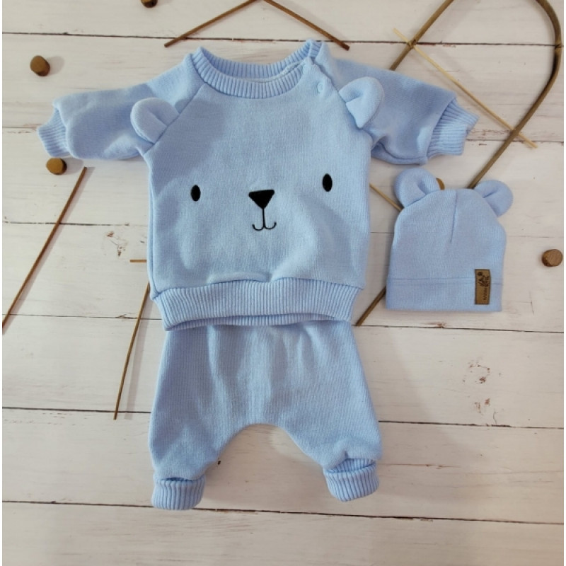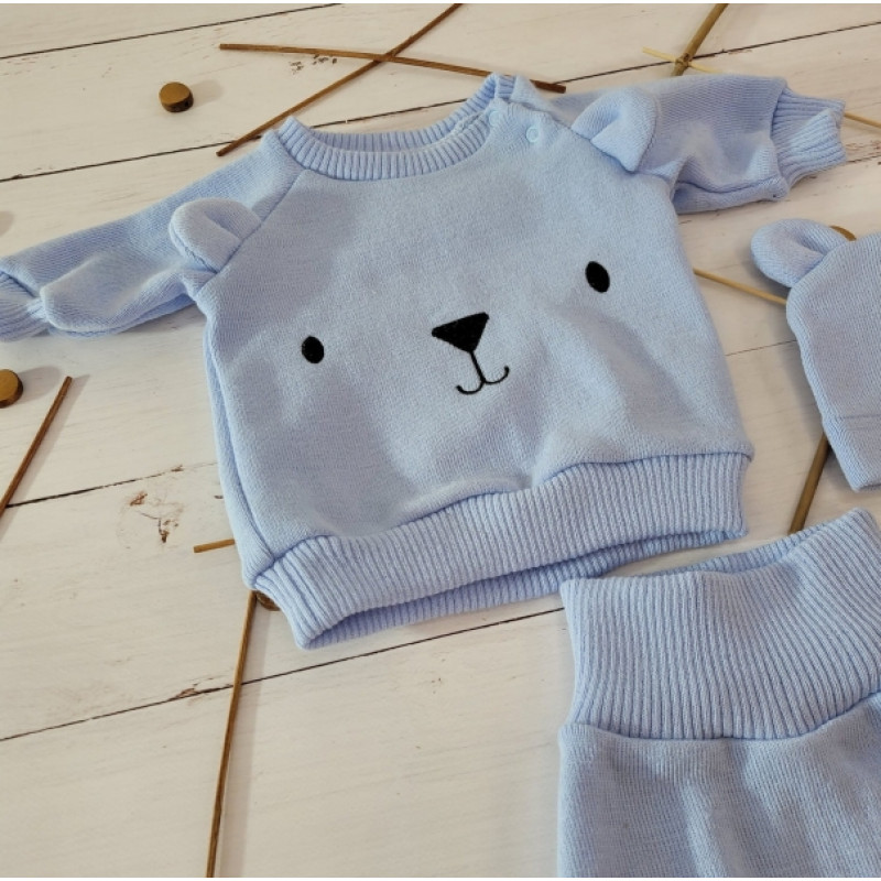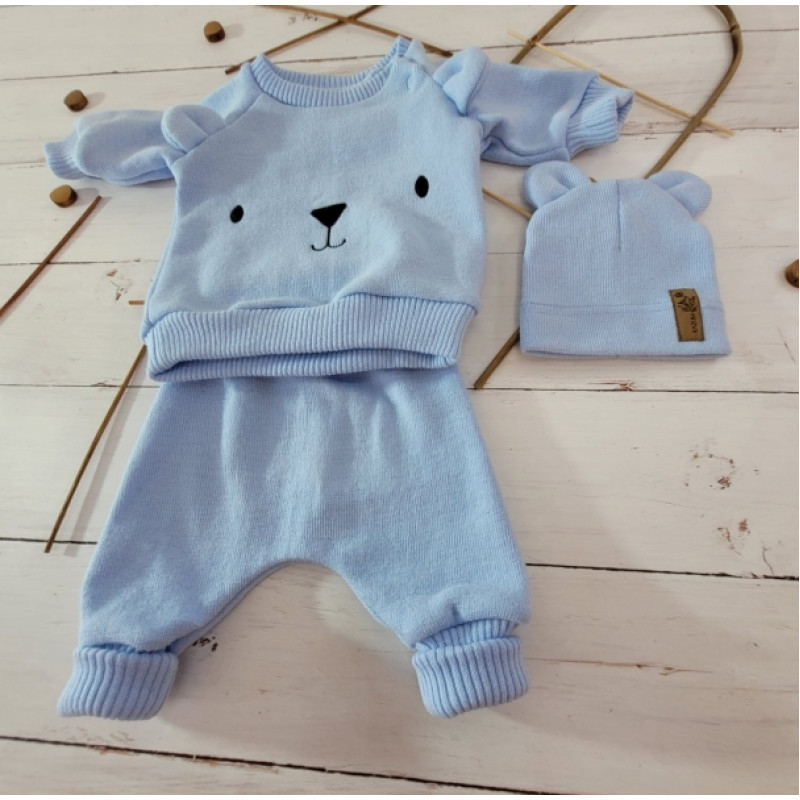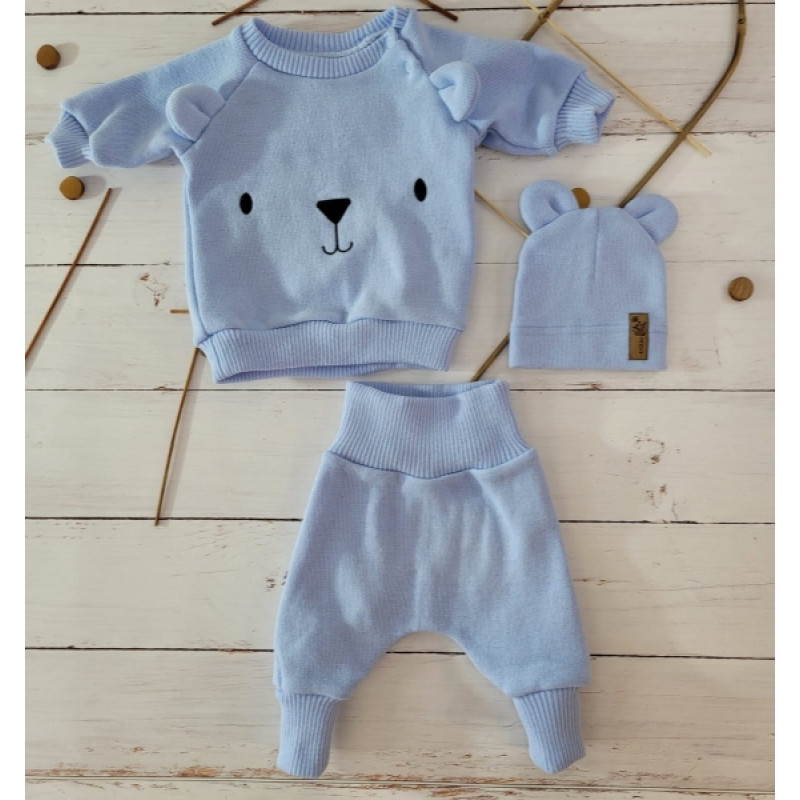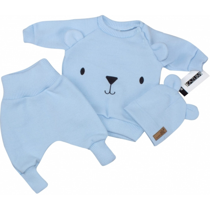 Pletená dojčenská sada 3D Medvedík, svetrík, tepláčiky + čiapočka Kazum, modrá, veľ. 68