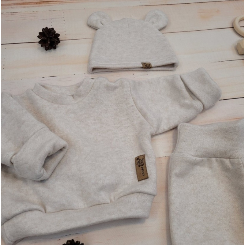Pletená dojčenská sada 3D, svetrík, tepláčiky + čiapočka Kazum, piesková, veľ. 80