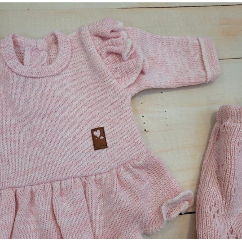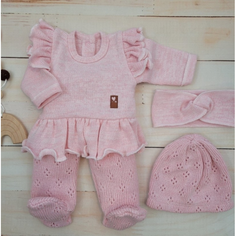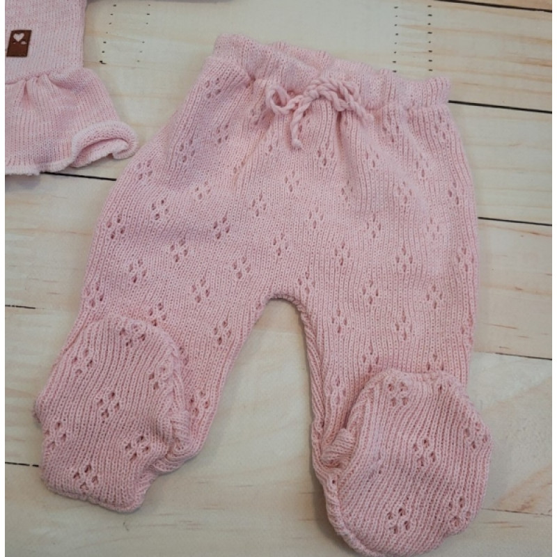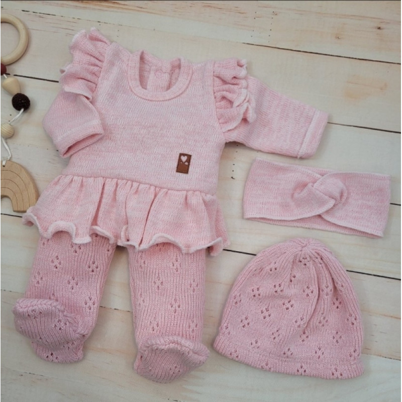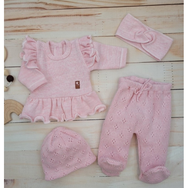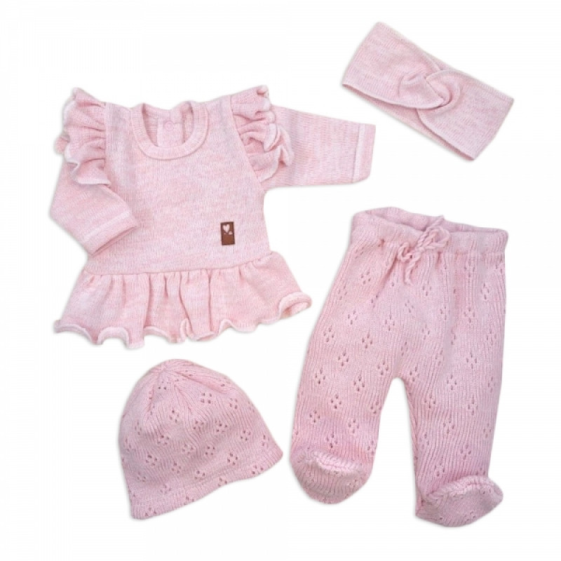 Pletená ažurková sada 4D, tunika, polodupačky, čiapočka + čelenka Kazum, ružová, veľ. 68