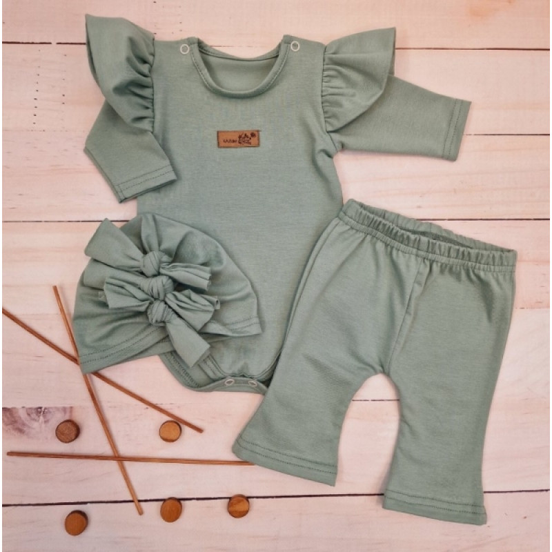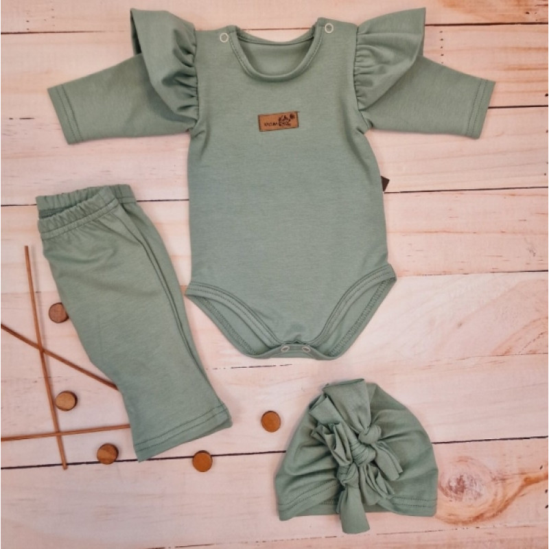Body s volánikmi, legíny do zvonu a čiapočka, 3D, bavlna, olivová, veľ. 68