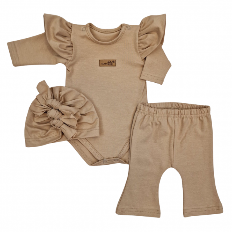 Body s volánikmi, legíny do zvonu a čiapočka, 3D, bavlna, cappuccino, veľ. 86