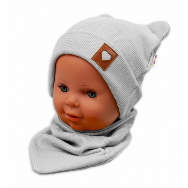 Baby Nellys Rebrovaná dvojvrstvová čiapka s uškami + šatka TEDDY - sivá, 80/86