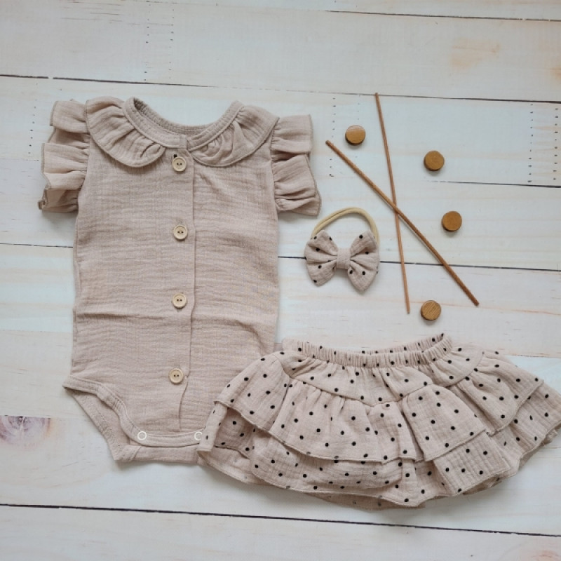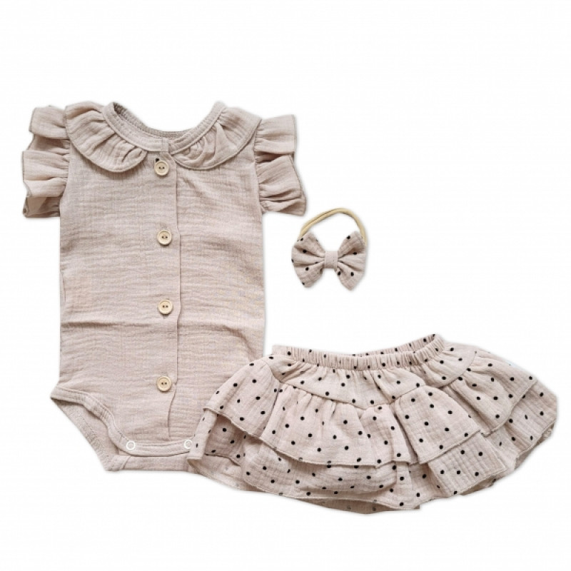 Mušelínová sukničkokraťasky, bodýčko a čelenka, 3D sada, béžový/dots