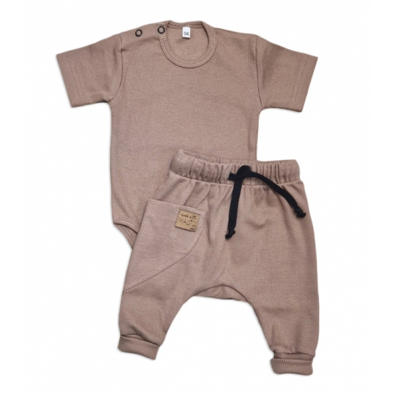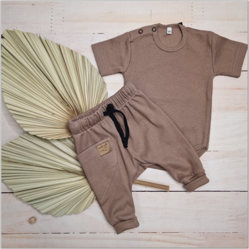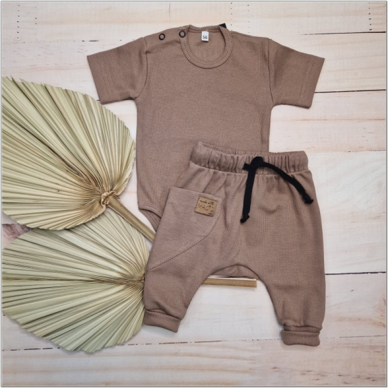 Rebrovaná súprava body kr. rukáv + tepláčky Magic, bavlna, čokoládová
