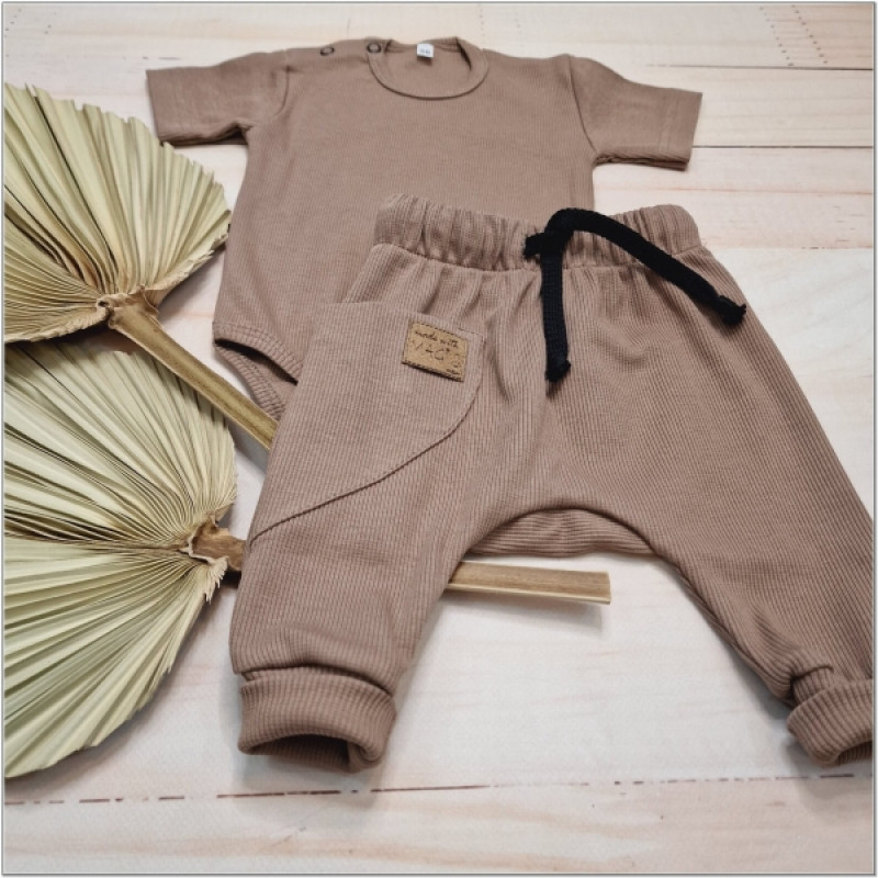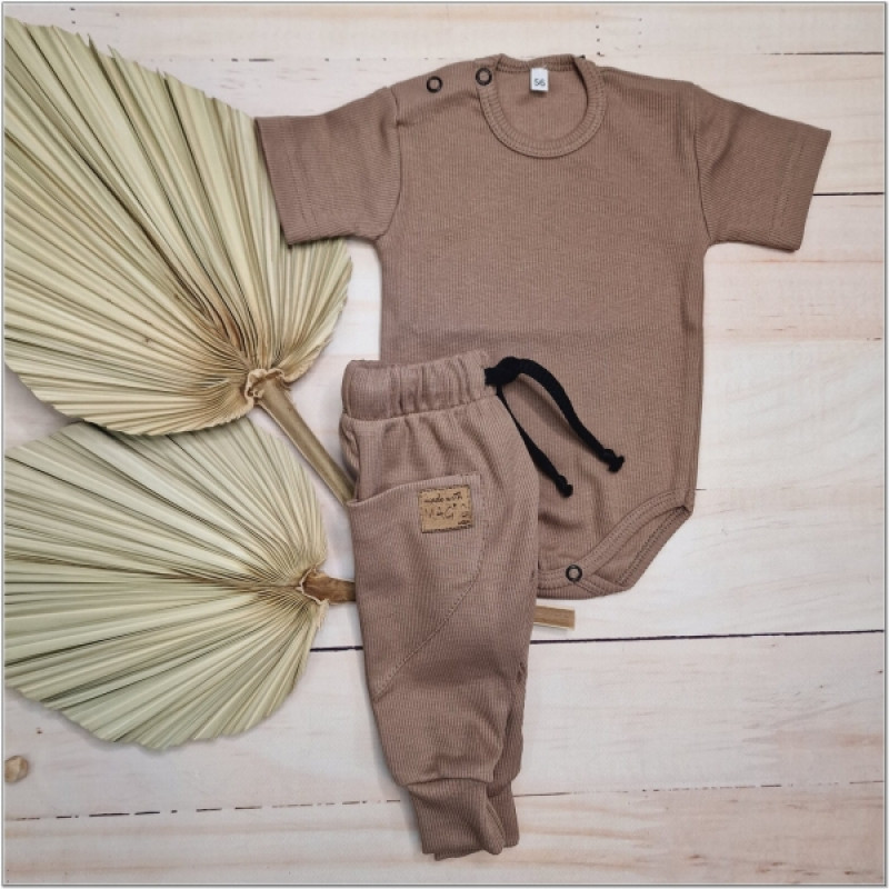 Rebrovaná súprava body kr. rukáv + tepláčky Magic, bavlna, čokoládová, veľ. 62