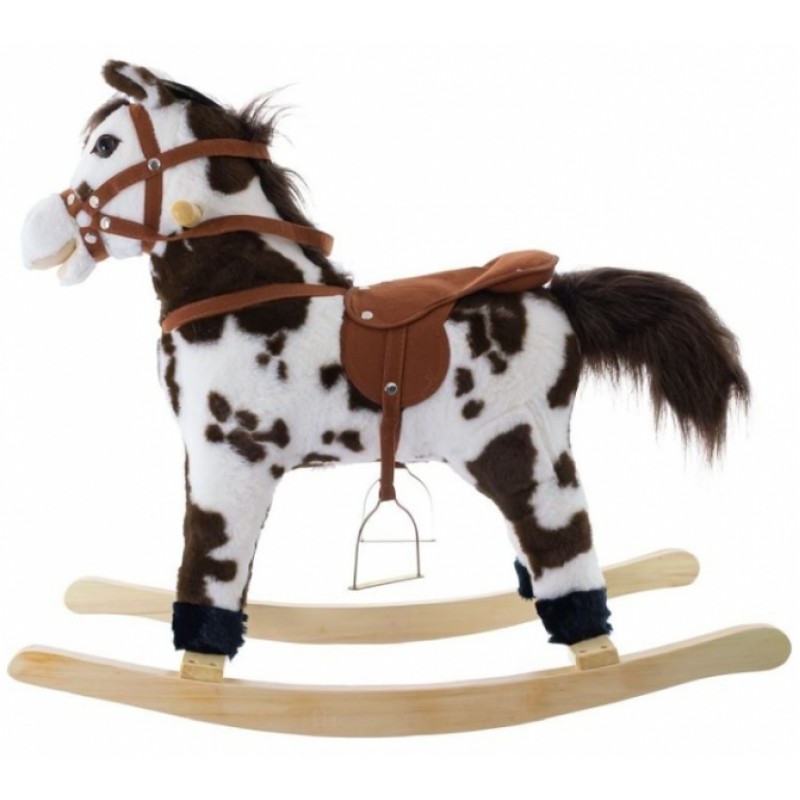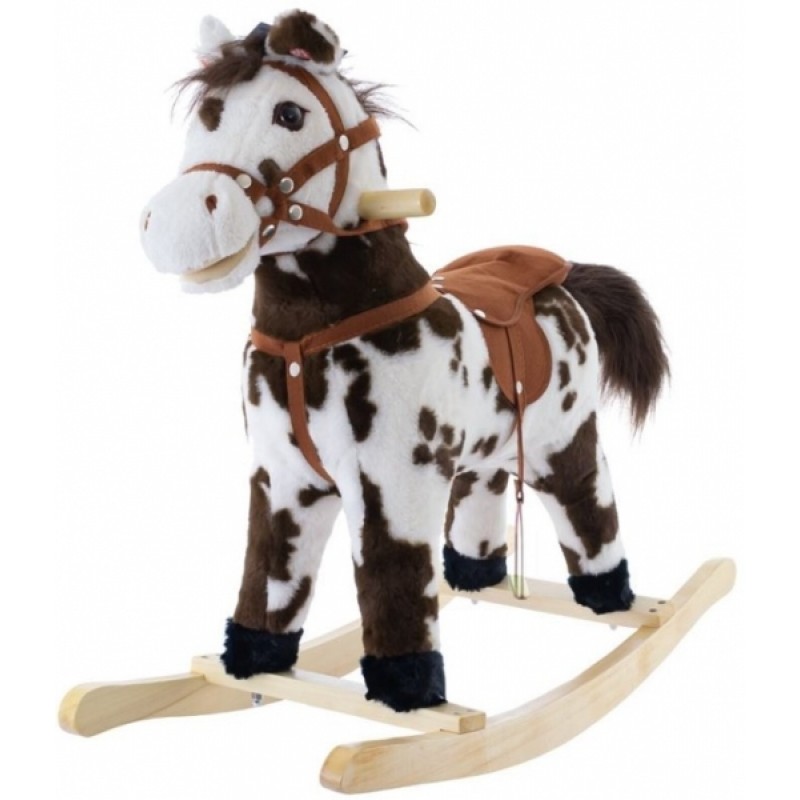 Hojdací kôň. Hračka je vyrobená z materiálu veľmi príjemného na dotyk. Kôň má pohodlné sedlo so strmeňmi a opratami a drevenými rukoväťami. Po stlačení ucha hračka vydáva rôzne zvuky a pohybuje chvostom a papuľou.