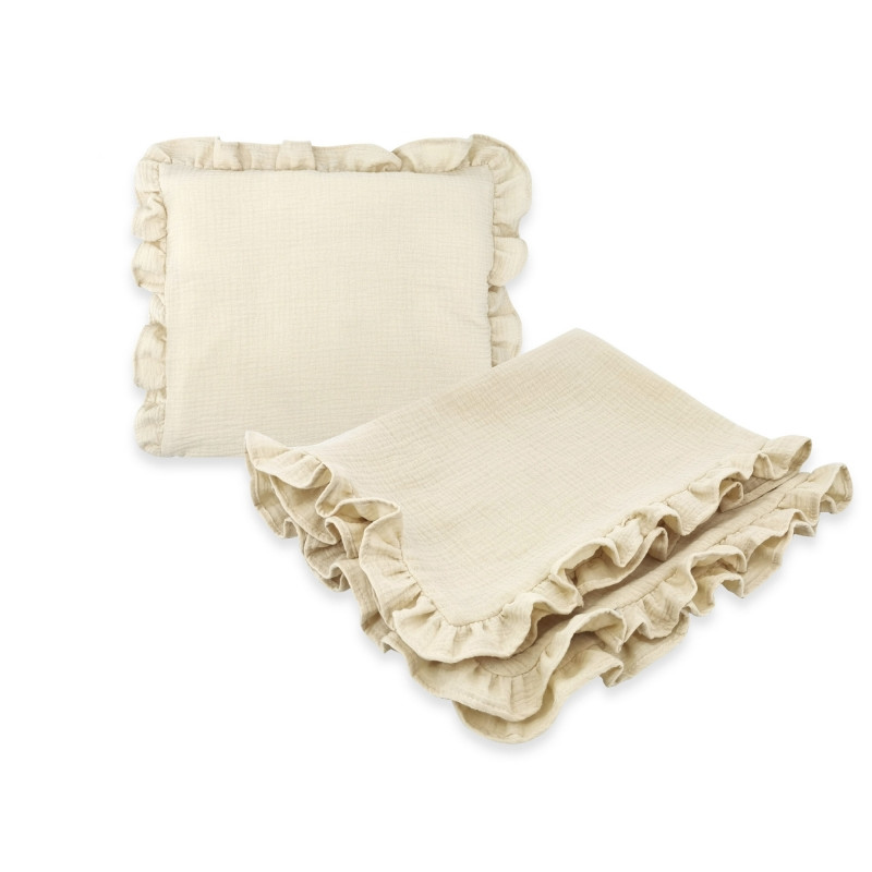 Táto sada zahŕňa mäkučkú deku s volánikom a vankúšik s obliečkou na zips, oboje vyrobené z prvotriedneho bavlneného mušelínu.