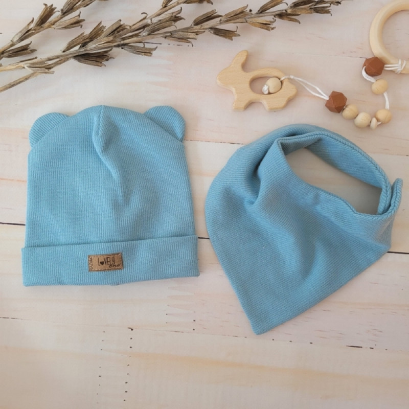 Dvojvrstvová rebrovaná čiapočka s uškami + šatka, Lovely One, morská modrá, veľ. 80/86