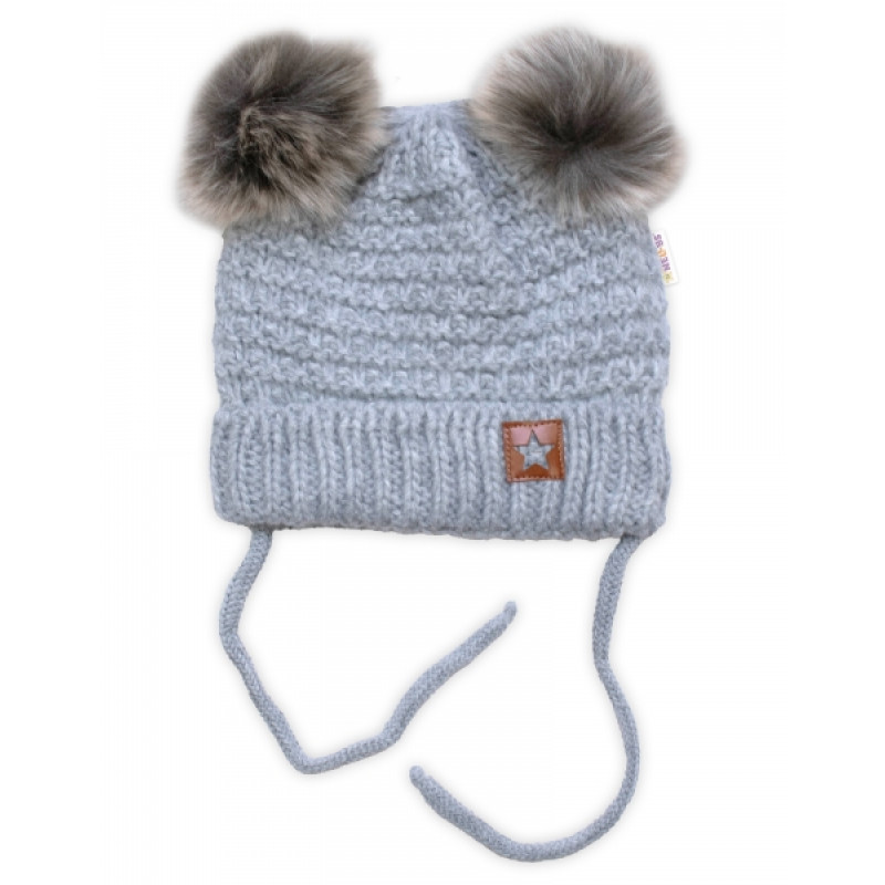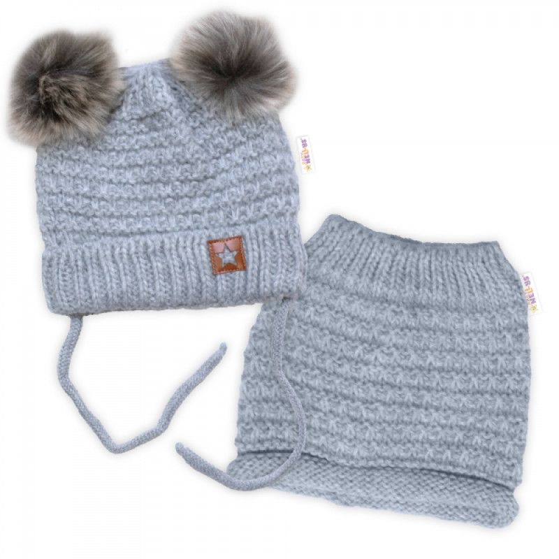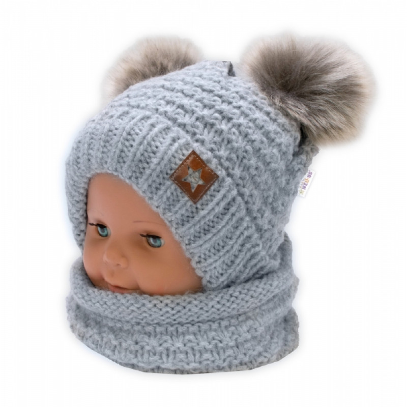 Zimná pletená čiapka Star s fleecom a chlpáčkové brmbolce + komínček 2D sada, sivý melírok