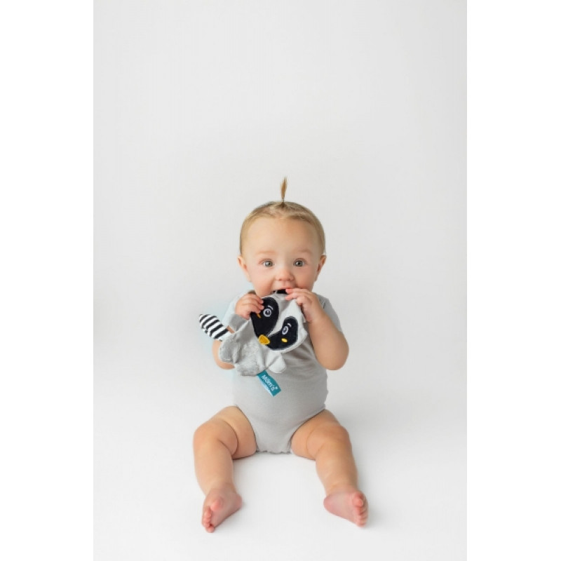 Šušťanie je vyplnené šuštiacou fóliou, ktorej jemný zvuk priťahuje pozornosť tých najmenších, poskytuje sluchové podnety. Jemné šušťanie bábätko upokojuje, pretože mu pripomína zvuky, ktoré počulo v mamičkinom brušku. Farebná visačka a kontrastný chvost stimulujú správny rozvoj uchopenia, jemnej motoriky a koordinácie oko-ruka. Vyšívaná tvár mývala Pedra vykúzli úsmev na tvári vášho najmenšieho. Šeľasť je ľahký a ľahko sa drží, takže môže vaše dieťa sprevádzať od prvých chvíľ ako v posteli, tak na prechádzke.