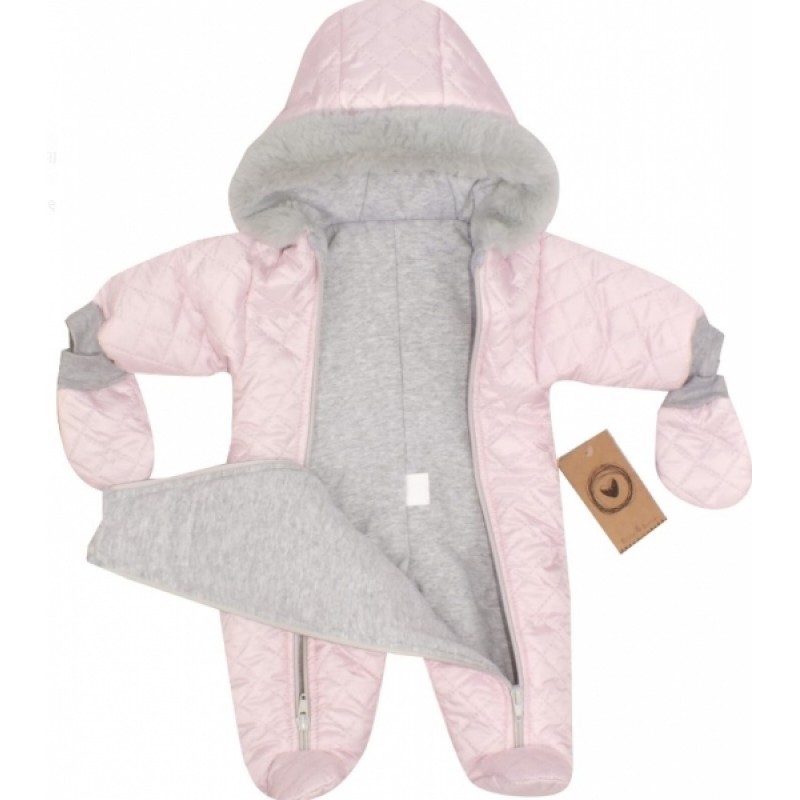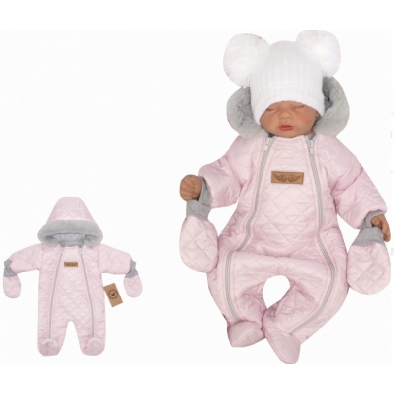 Z&Z Zimná prešívaná kombinéza s kožušinou a kapucňou + rukavičky - sv.ružová, veľ. 62
