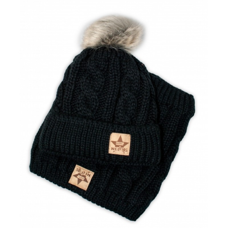 BABY NELLYS Zimná pletená čiapka s brmbolcom + komín, čierna, veľ. 104/116