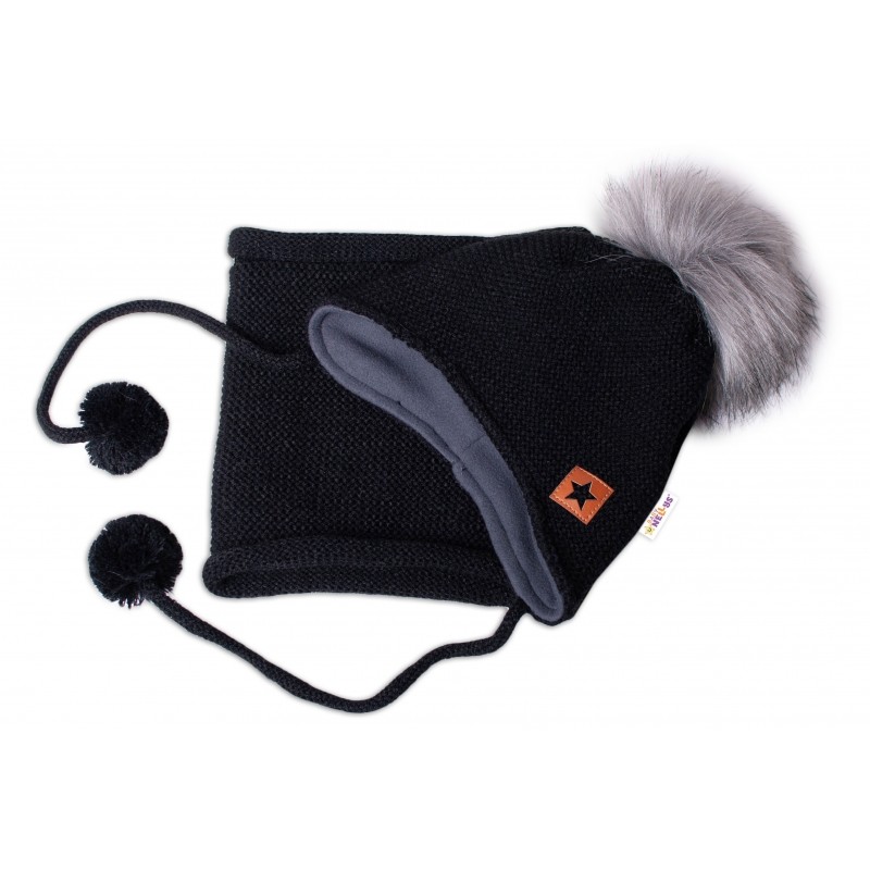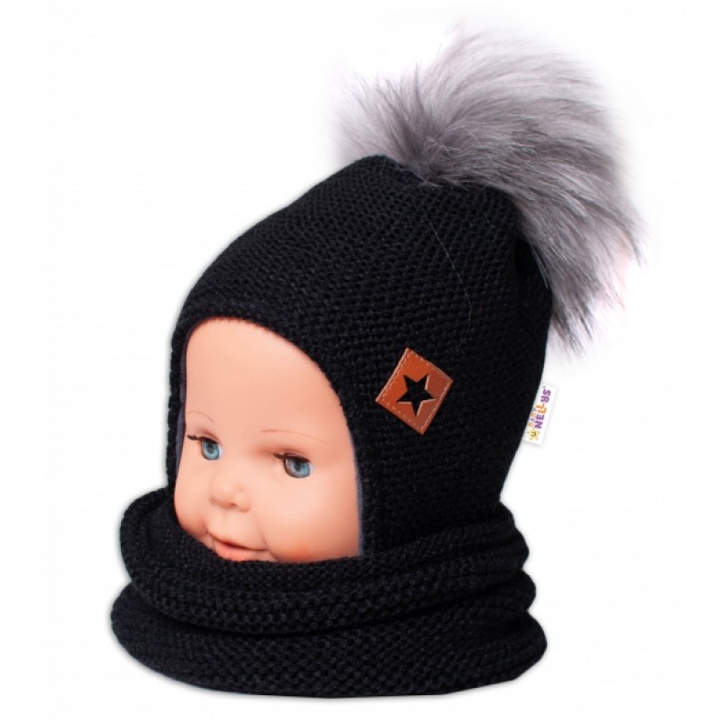 BABY NELLYS Zimná čiapka s fleecom a chlupáčková bambuľka Star + komínok -čierna, 104/116