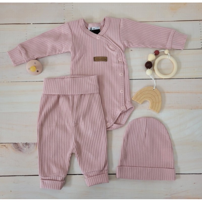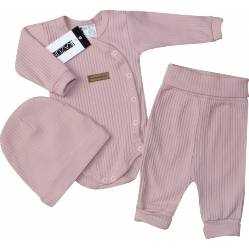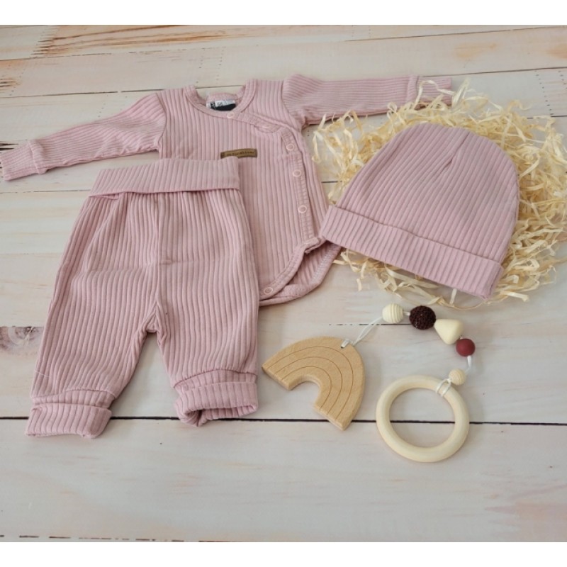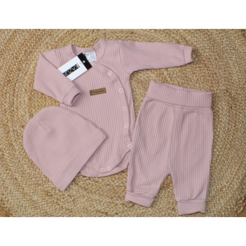 Rebrované zavinovacie body, tepláčky a čiapočka Kazum 3D bavlnená sada, púdrová, veľ. 68