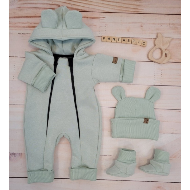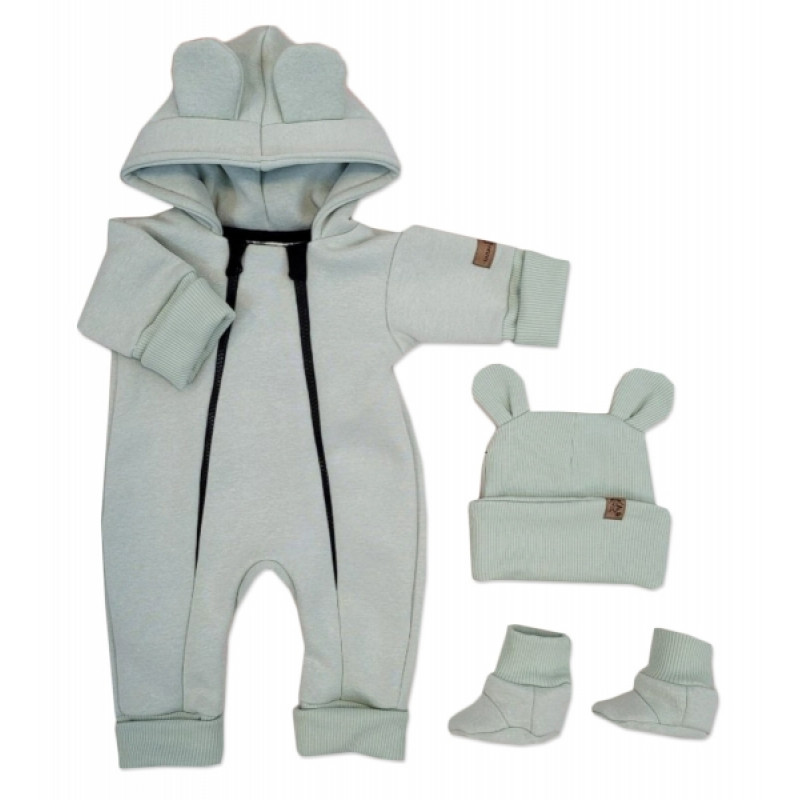 Oteplený detský overal bez šľapiek s kapucňou, čiapočka + topánočky, 3D, Kazum, mätový