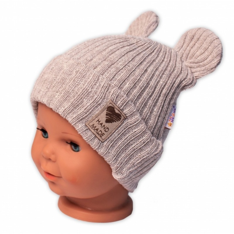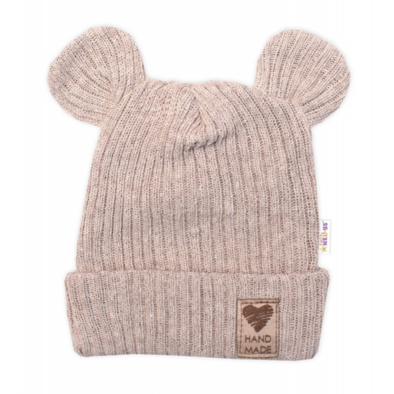 Pletená bavlněná čiapka s uškami, dvojvrstvová, Hand Made Baby Nellys, béžová, veľ. 68/74
