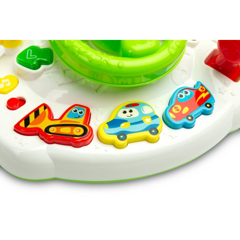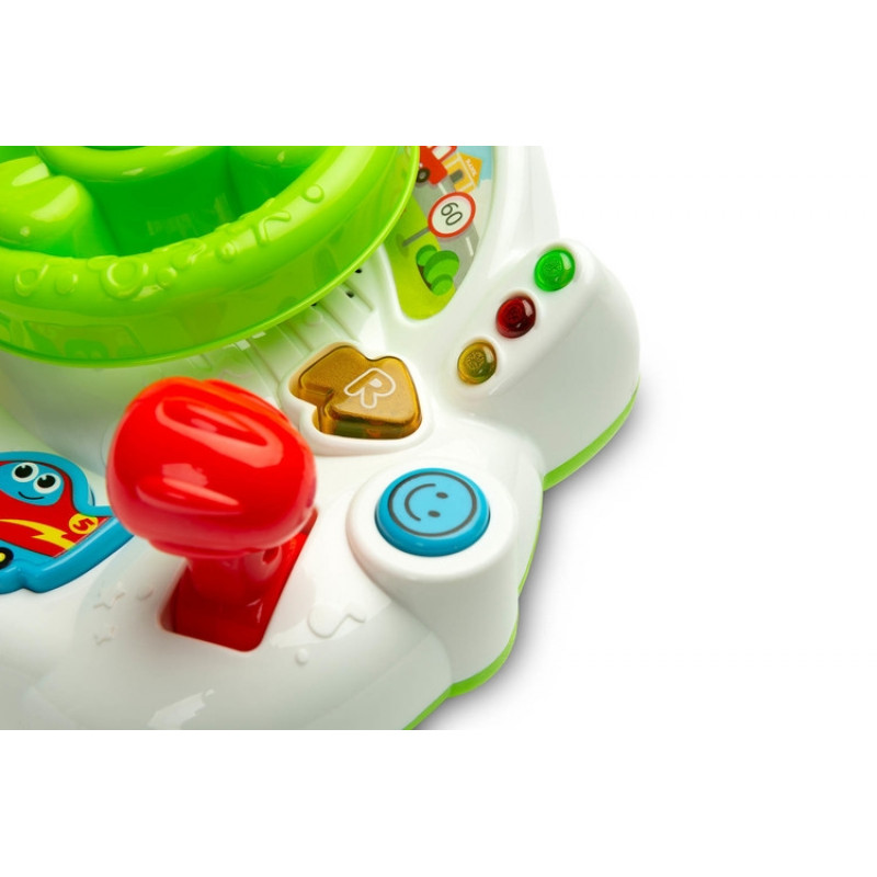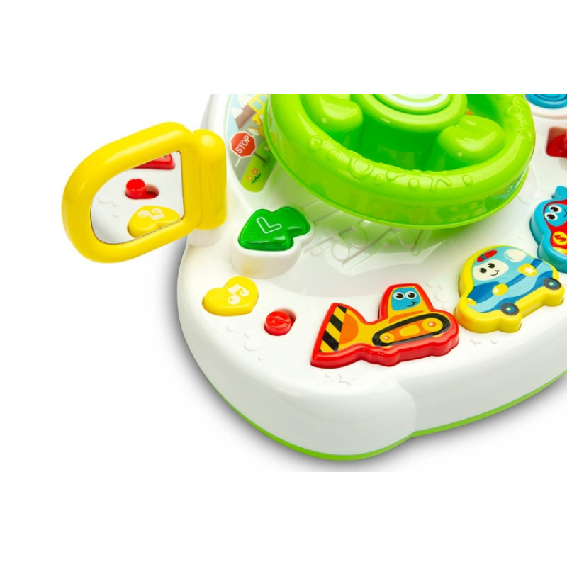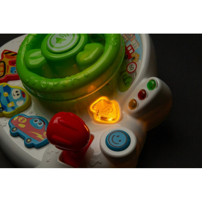 Volant je vybavený tlačidlami a svetlami, ktoré v kombinácii s reproduktorom prehrávajú príjemné melódie a zvuky áut.