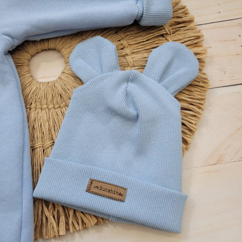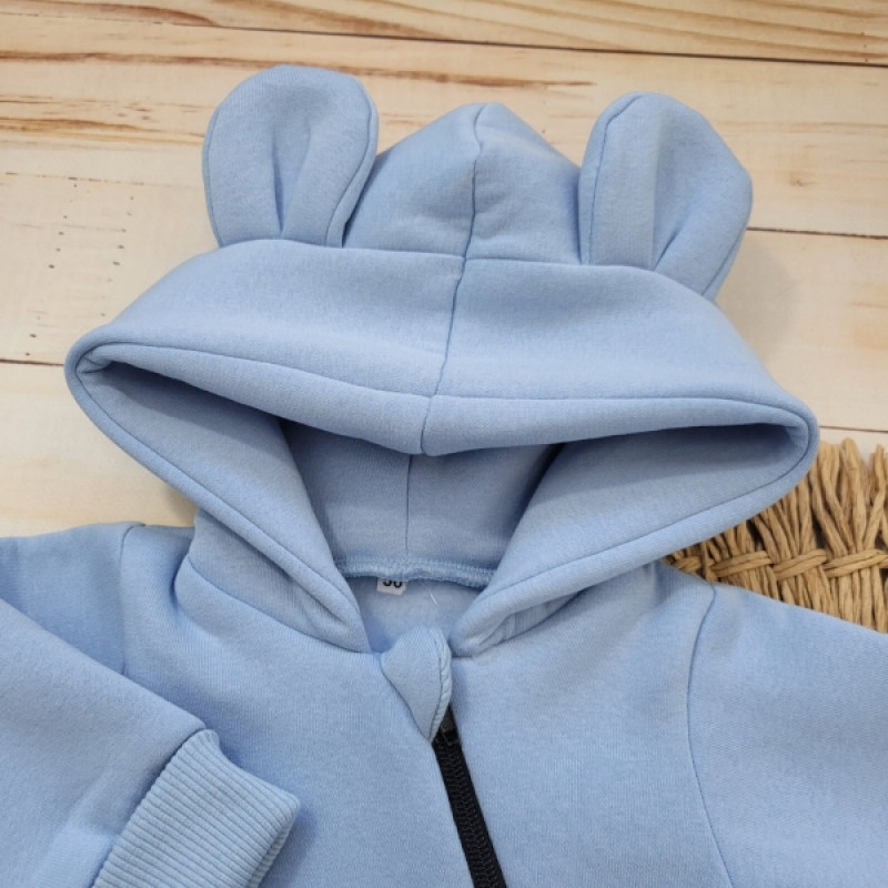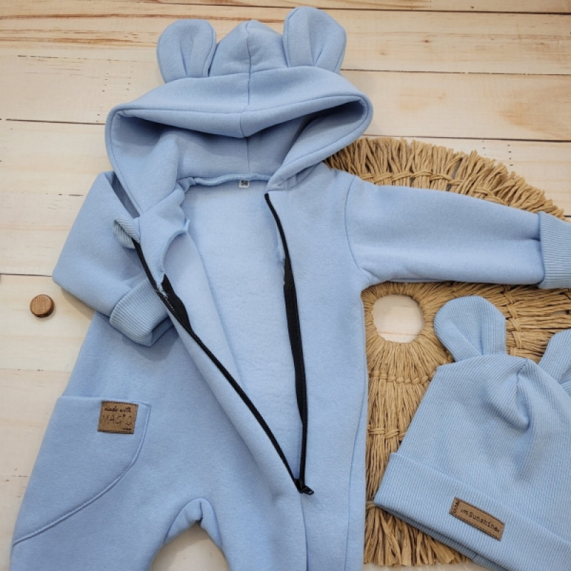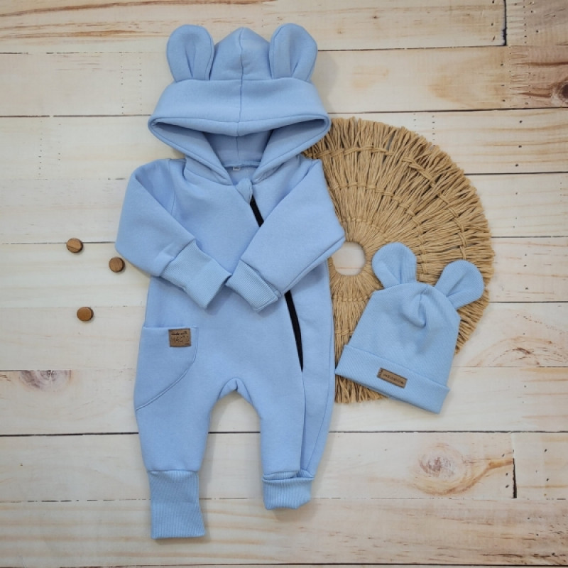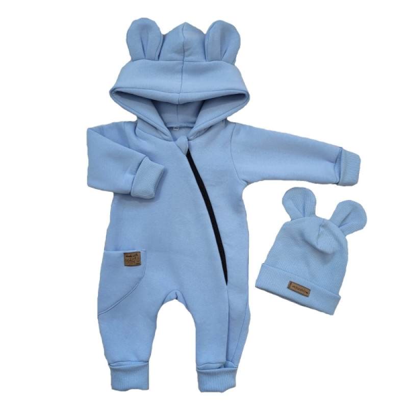 Oteplený detský overal bez šľapiek s kapucní + čiapočka, 2D, modrý, veľ. 68