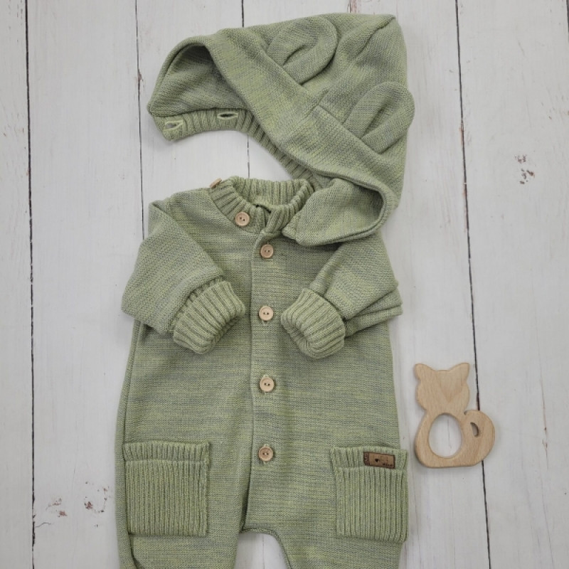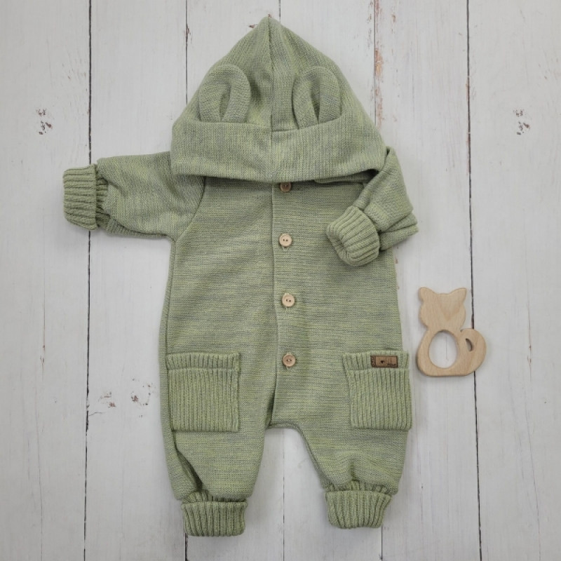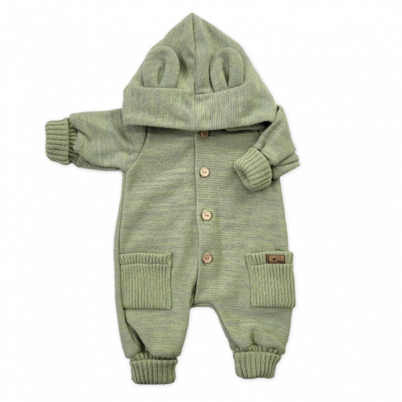 Detský pletený overálok s odopínacou kapucňou - olivový, 68/74