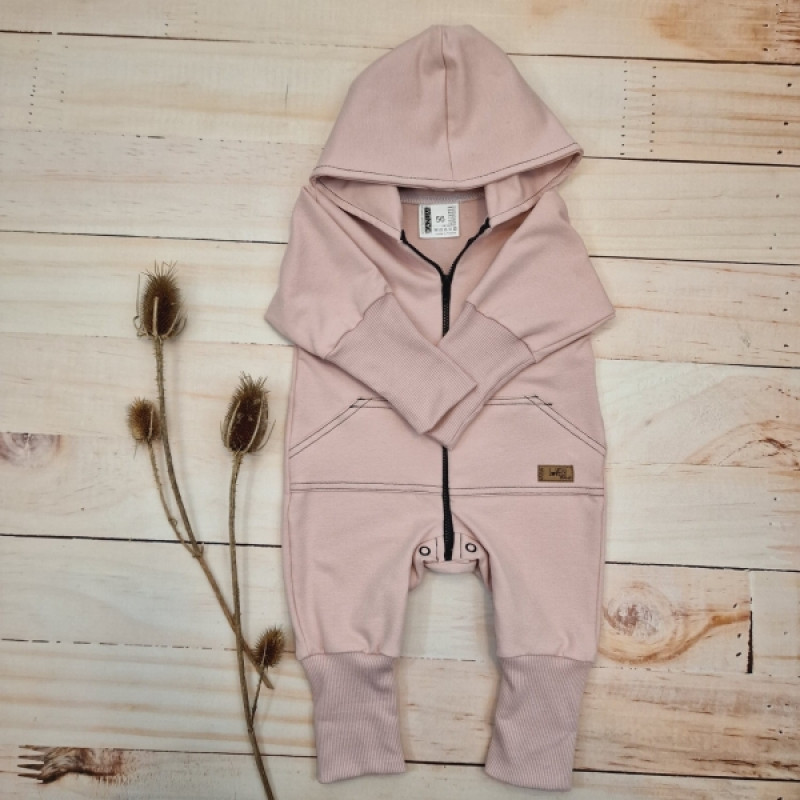 Detský teplákový overal s predĺženými nápletami, púdrovo ružový, veľ. 80