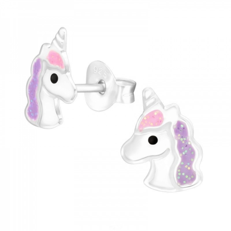 Detské strieborné náušničky Jednorožec Glitter, puzetové
