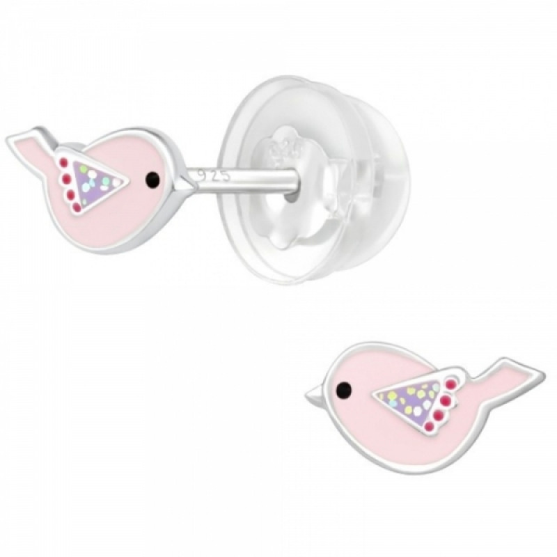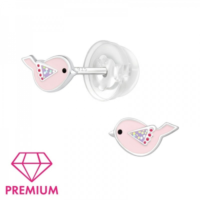 Detské strieborné náušničky premium Vtáčik ružový, puzetové