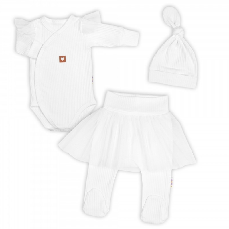Sada obsahuje: polodupačky so šifónovou sukničkou, body s dlhým rukávom a ozdobnými volánikmi a čiapočku uzlík.