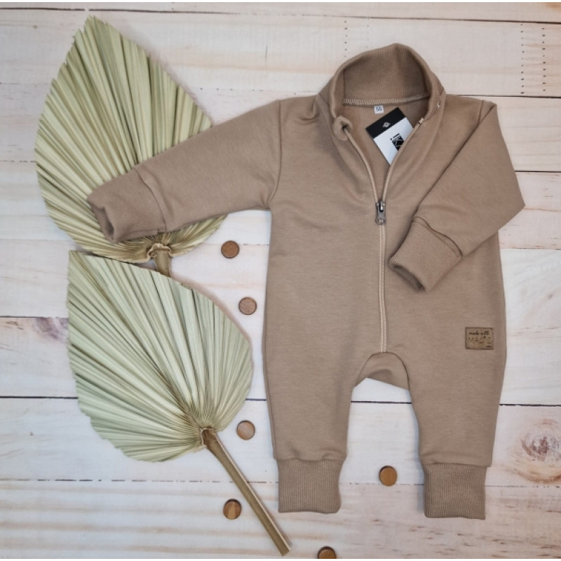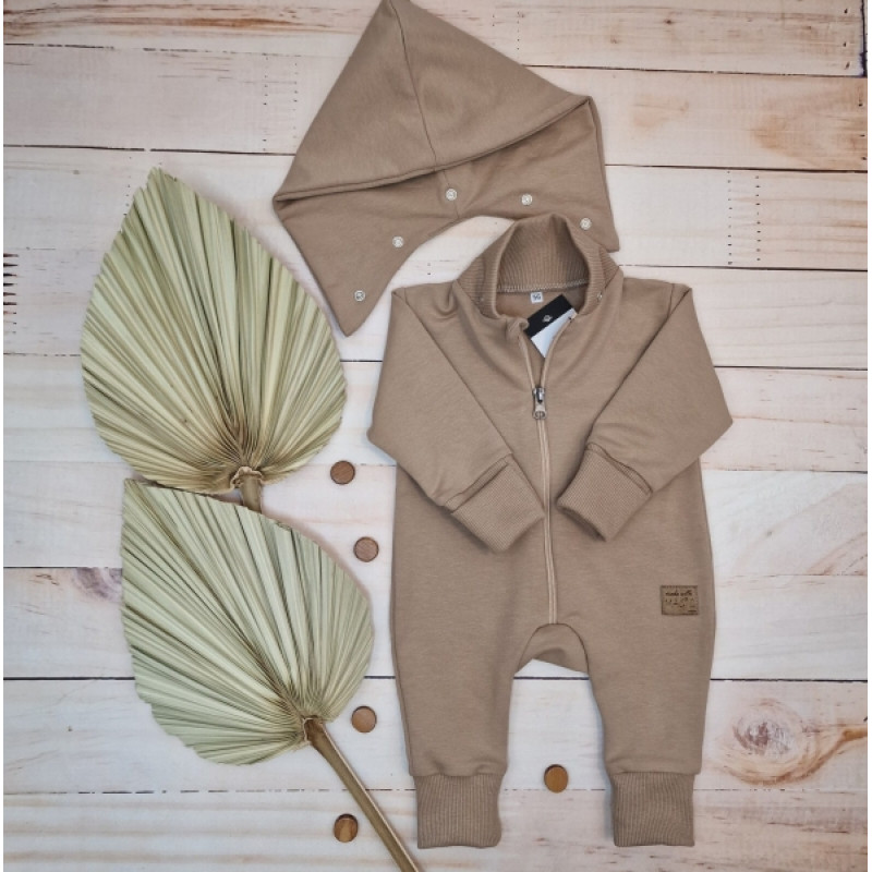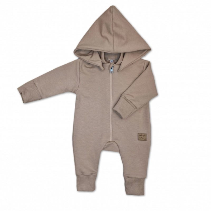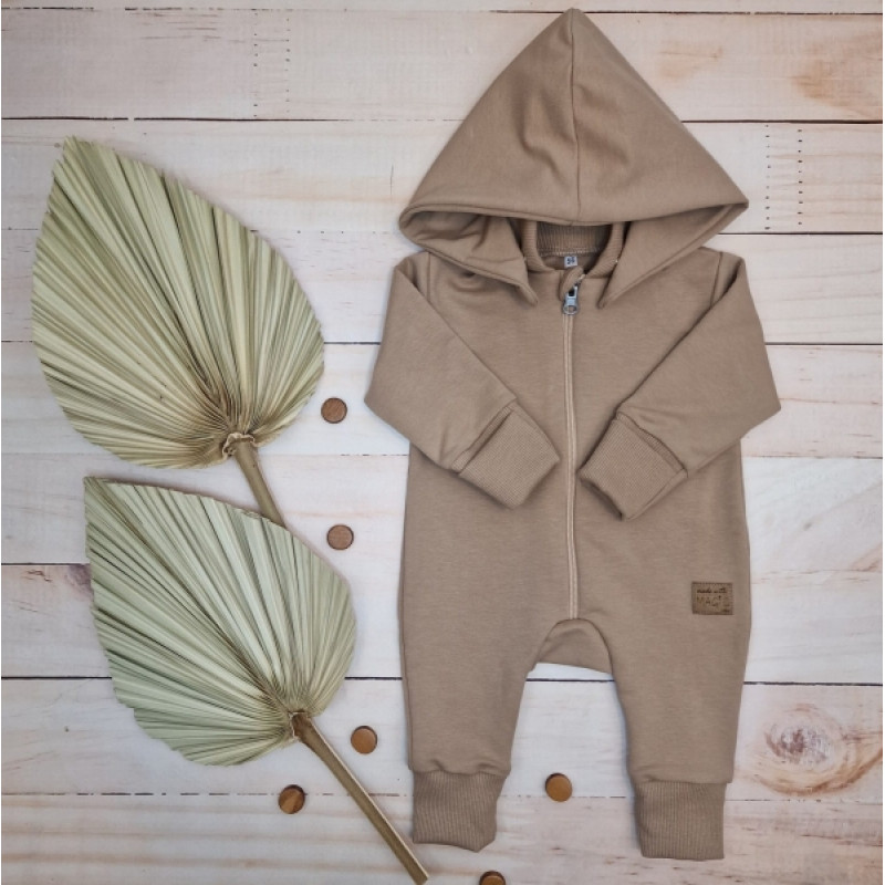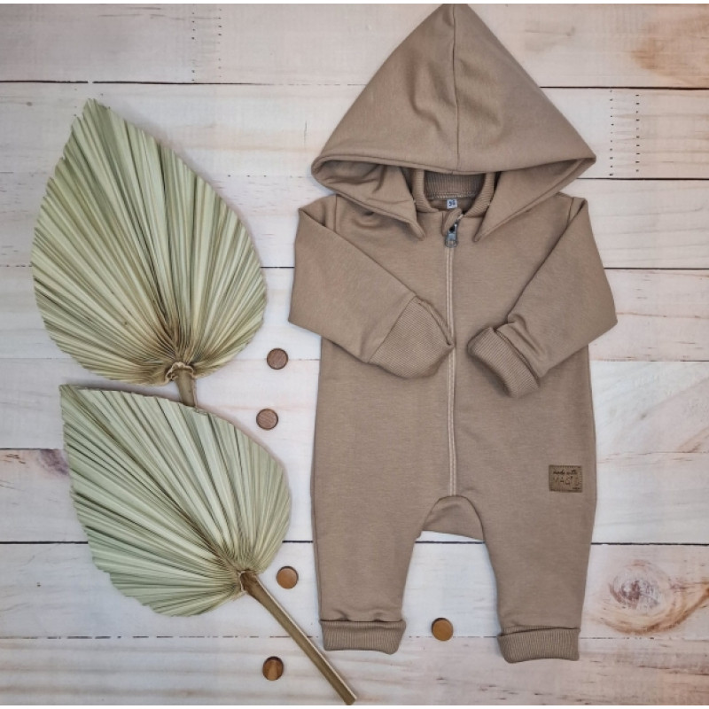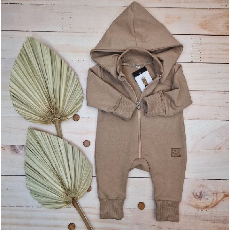 Detský teplákový overal bez šľapiek s odopínateľnou kapucňou, bavlna, mocca, veľ. 74