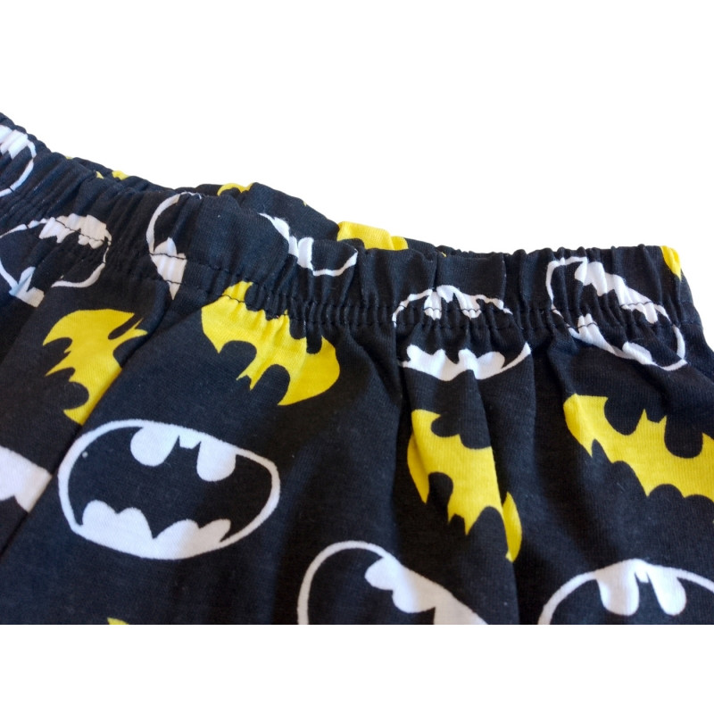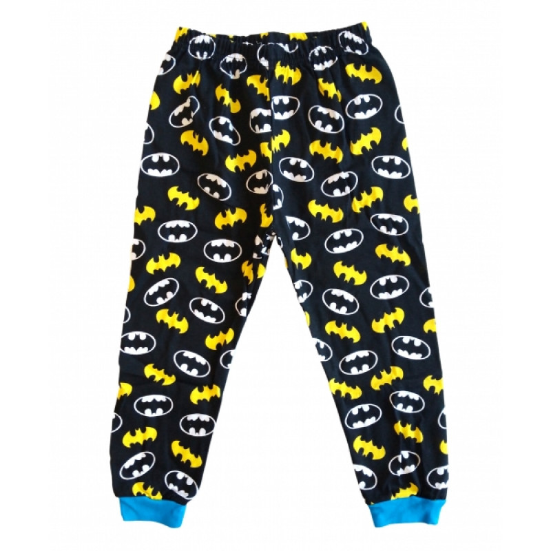 Kalhoty jsou navrženy v černém provedení s celoplošným potiskem netopýřího loga v typických žluto-černých barvách. Díky elastickému pasu perfektně sedí a neškrtí, což zajišťuje pohodlí při nošení. Nohavice jsou zakončeny modrými náplety, které ladí s detaily na tričku a zabraňují vyhrnování během spánku. Materiál je příjemný na dotek a zajišťuje dostatečnou prodyšnost pro klidný noční odpočinek.