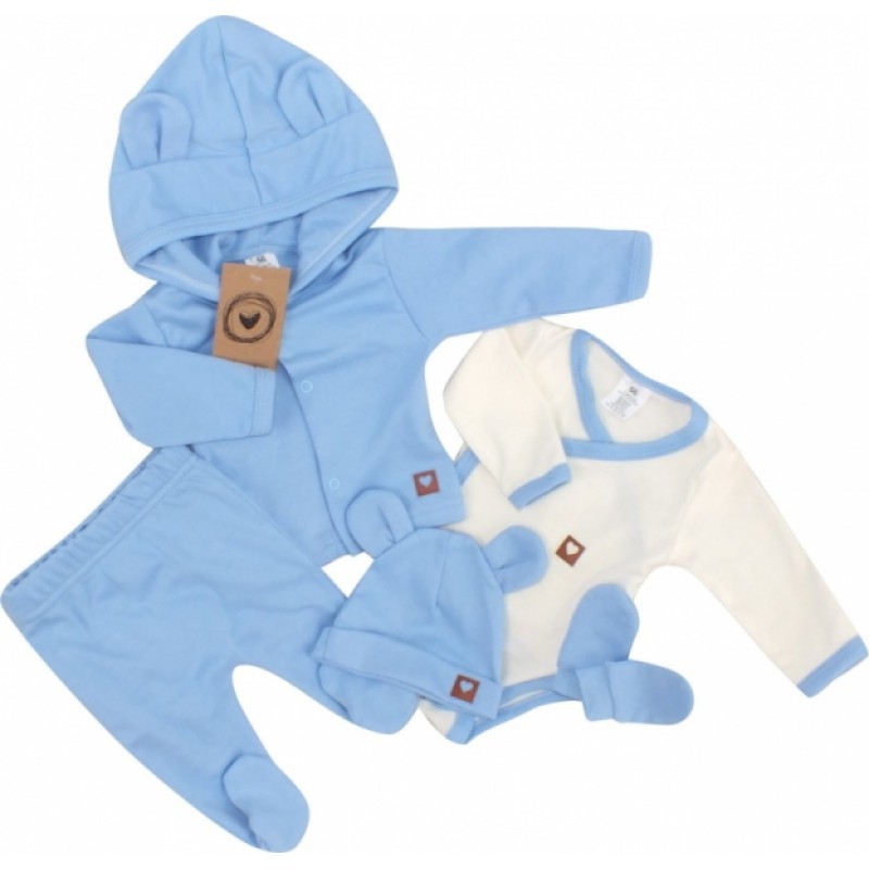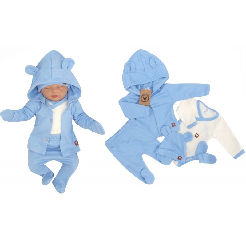 Sada do pôrodnice 5D, body, polodupačky, kabátik, čiapočka, rukavičky - modrá