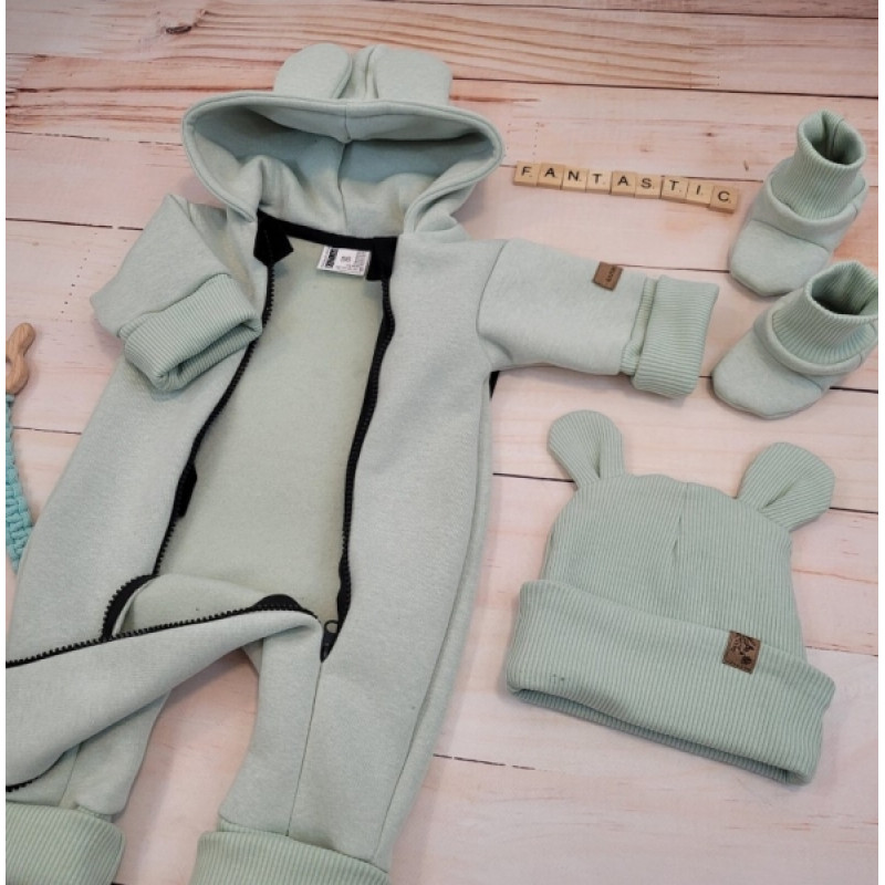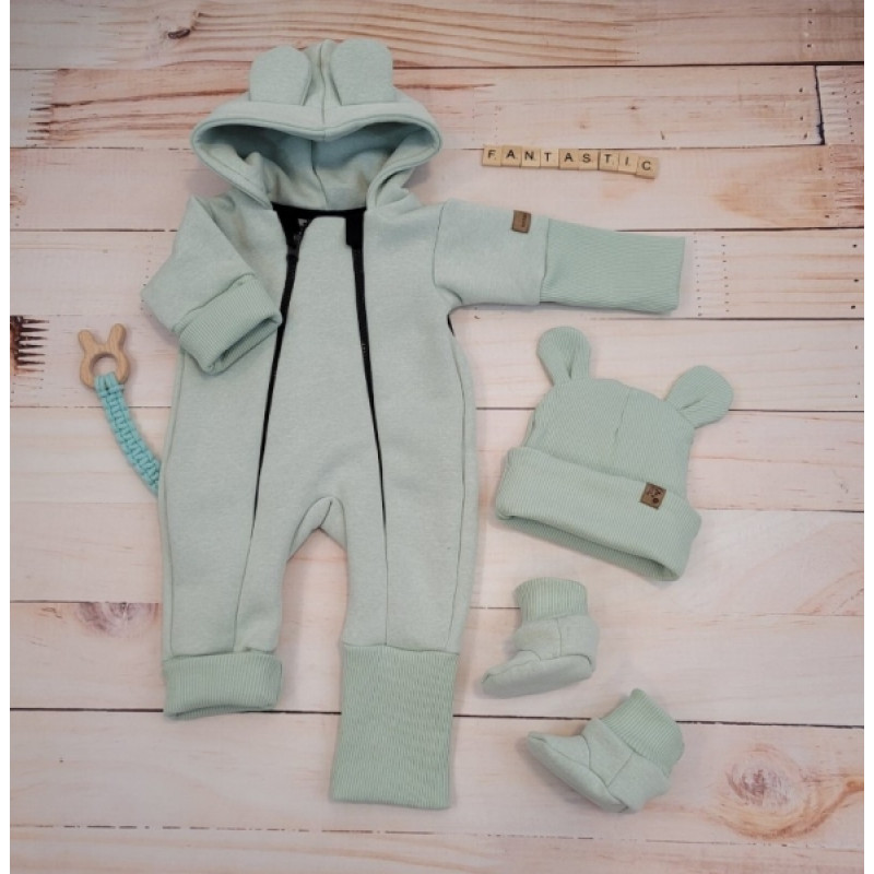 Oteplený detský overal bez šľapiek s kapucňou, čiapočka+topánočky,3D,Kazum, mätový, veľ.62