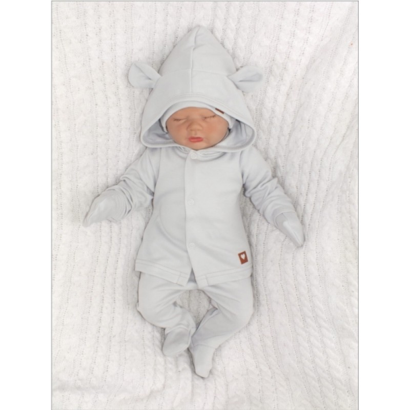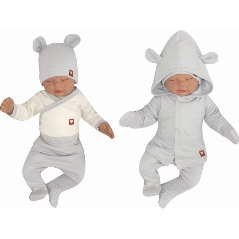 Sada do pôrodnice 5D, body, polodupačky, kabátik, čiapočka, rukavičky - sivá, veľ. 62