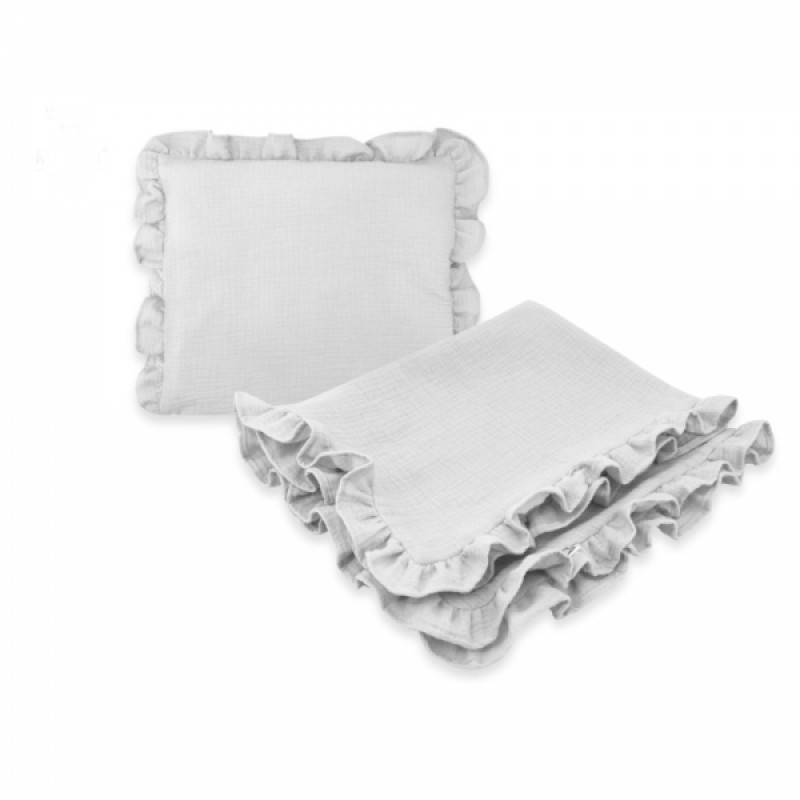 Táto sada zahŕňa mäkučkú deku s volánikom a vankúšik s obliečkou na zips, oboje vyrobené z prvotriedneho bavlneného mušelínu.