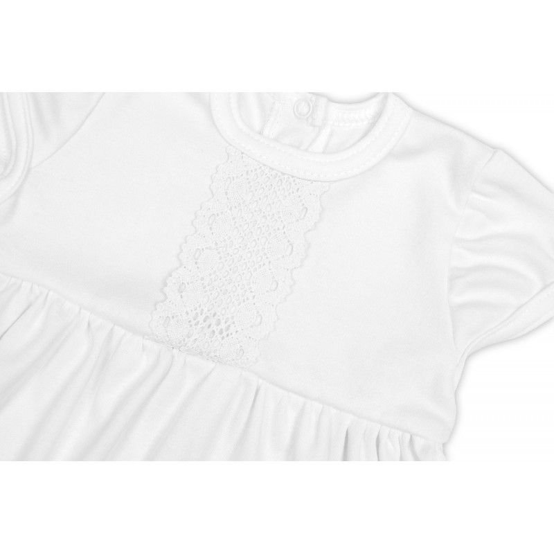 Bavlnené šatočky v bielej farbe s jemným čipkovaným zdobením a krátkym rukávom.