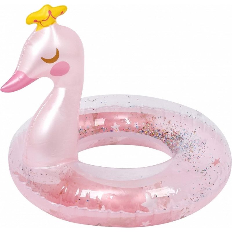 Plávajte štýlovo s nafukovacím kruhom v tvare labute, ktorý je ozdobený korunkou na hlave.