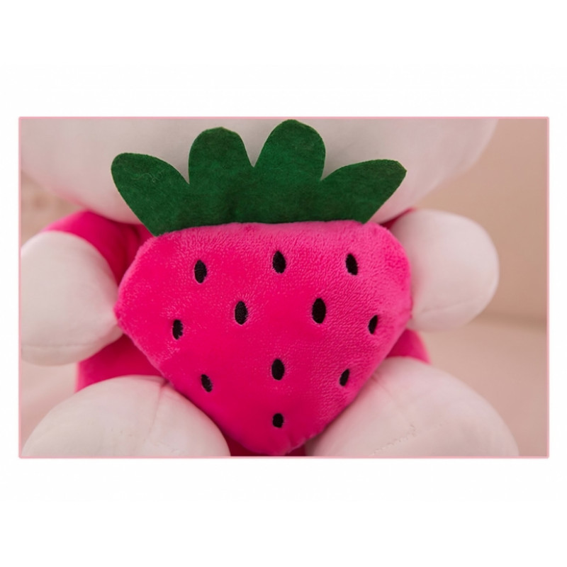 Hračka je vyrobená z veľmi jemného a na dotyk príjemného plyšu, ktorý je bezpečný aj pre najmenšie deti. Výplň je mäkká, ale zároveň dostatočne pevná, aby si hračka zachovala svoj tvar aj pri častom maznaní. Detaily ako oči, fúzy či semienka na jahode sú kvalitne vyšité, čo zaručuje dlhšiu životnosť a bezpečnosť pri hraní.
