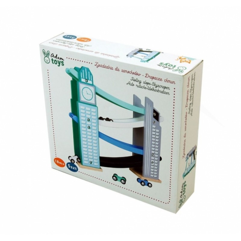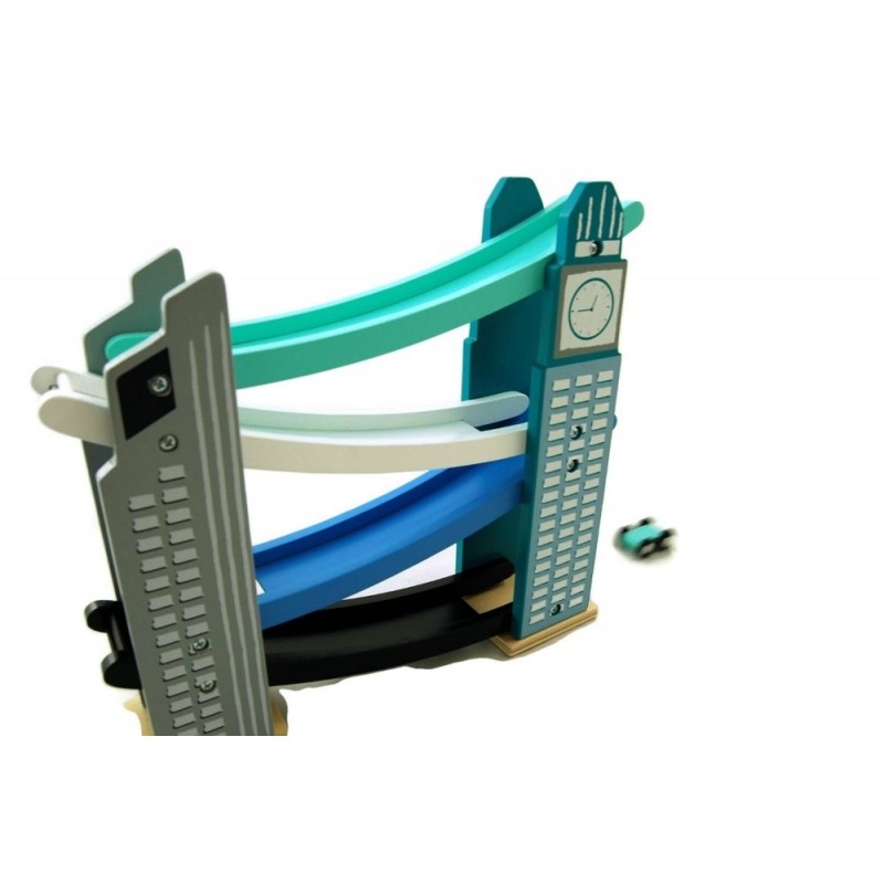 Pestrofarebná závodná dráha z dreva, kde autíčka zosúva jednotlivé poschodia až dôjdu do cieľa.