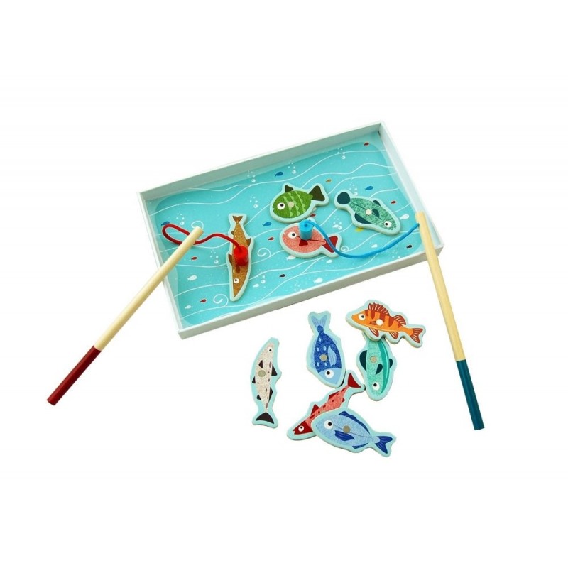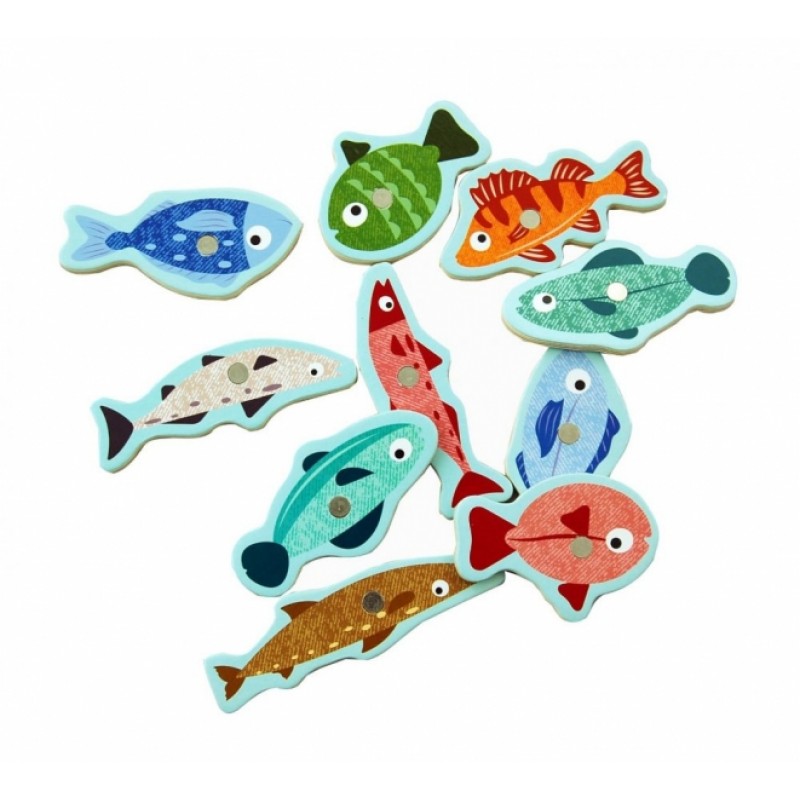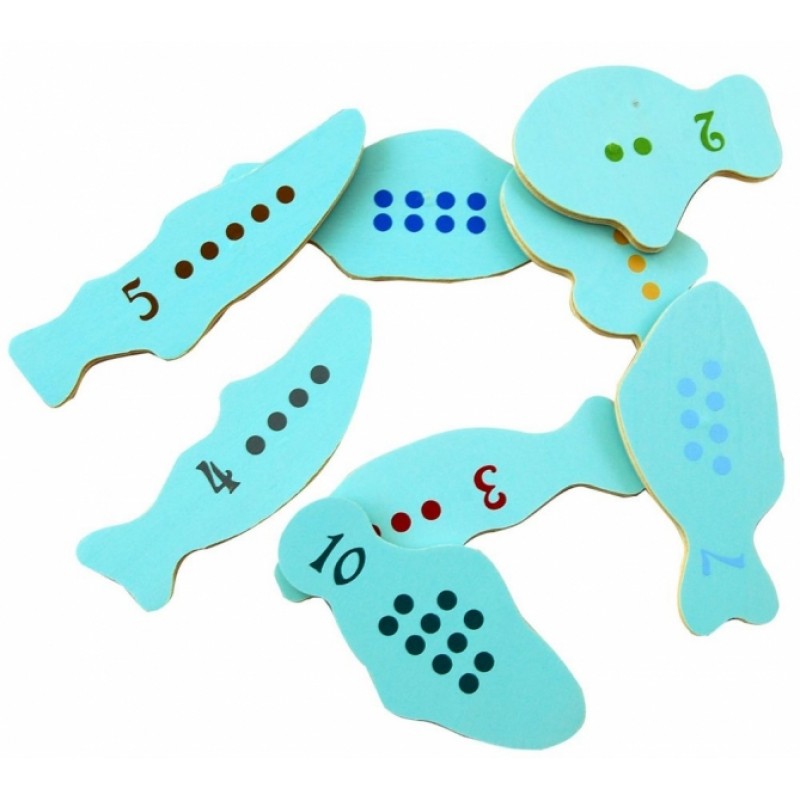 - 10 ks drevených farebných rybičiek (každá rybička je označená z druhej strany počtom bodov),