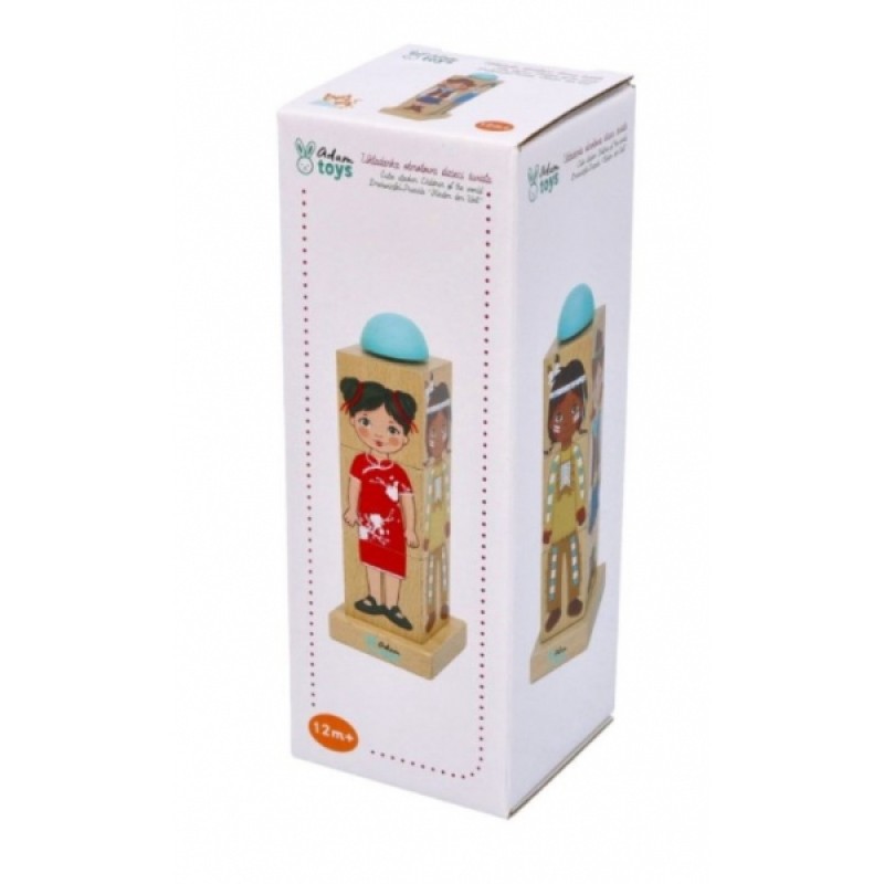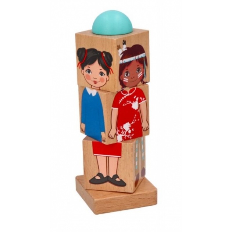 Tu je stojaca hračka s tromi kubickými blokmi na kolo. Bloky je možné ľubovoľne otáčať a vytvoriť tak štyri postavy predstavujúce deti žijúce v rôznych oblastiach sveta.