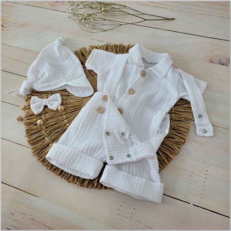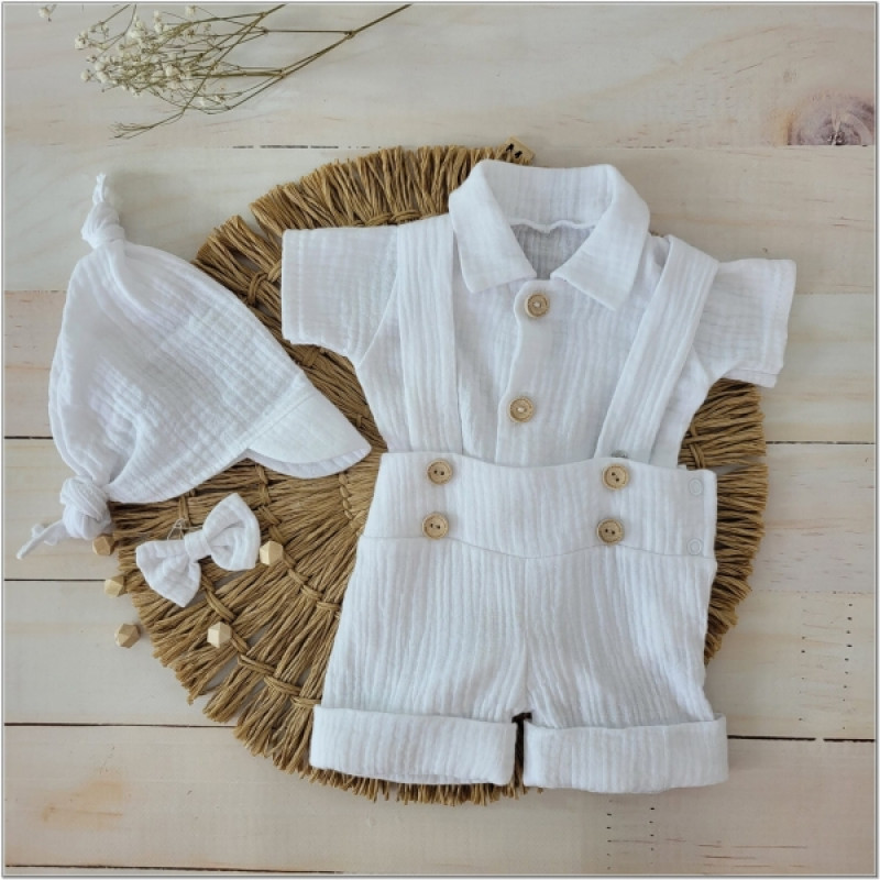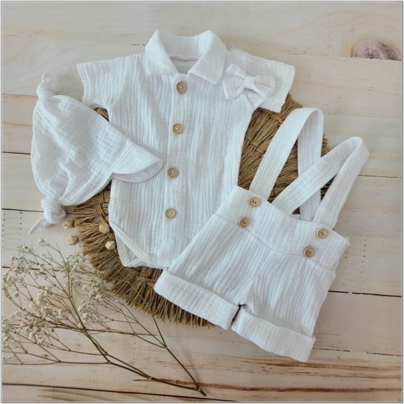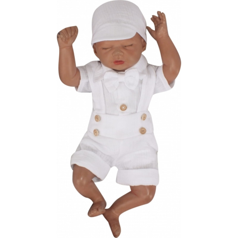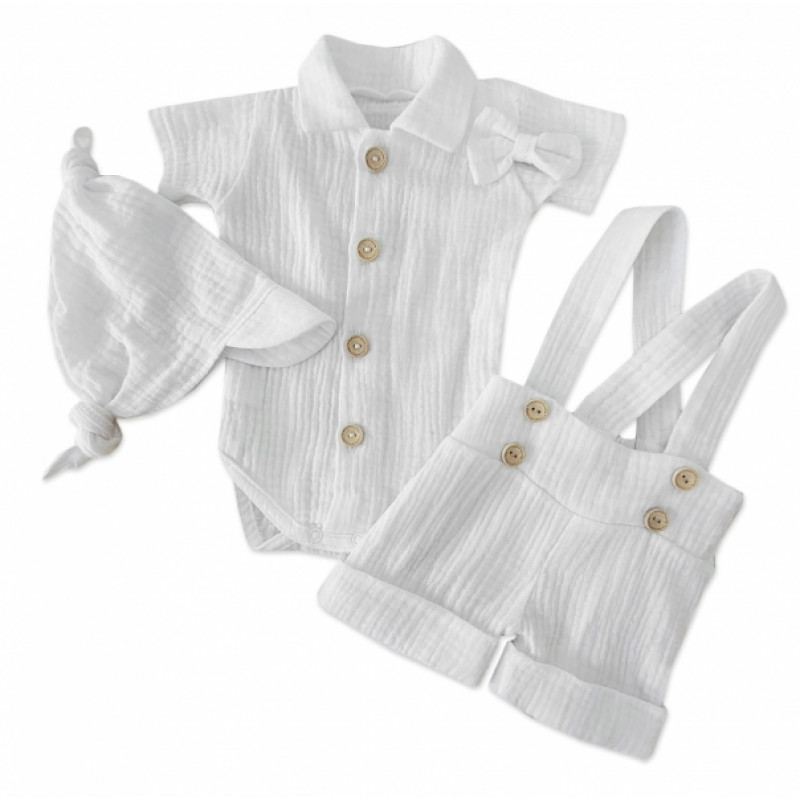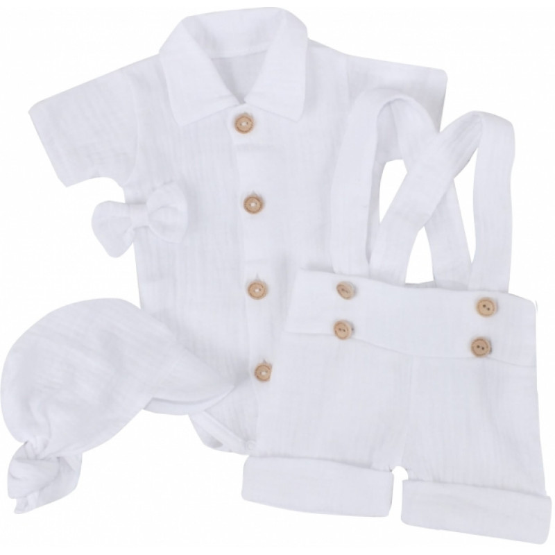 Mušelínové kraťasy s láclom, bodýčko, čiapočka, motýlik 4D sada, Z&Z, biela/biela