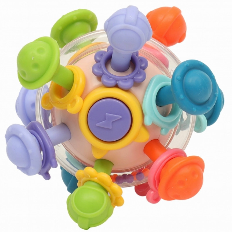 V strede hračky sa nachádza priehľadná hrkálka s drobnými guľôčkami.