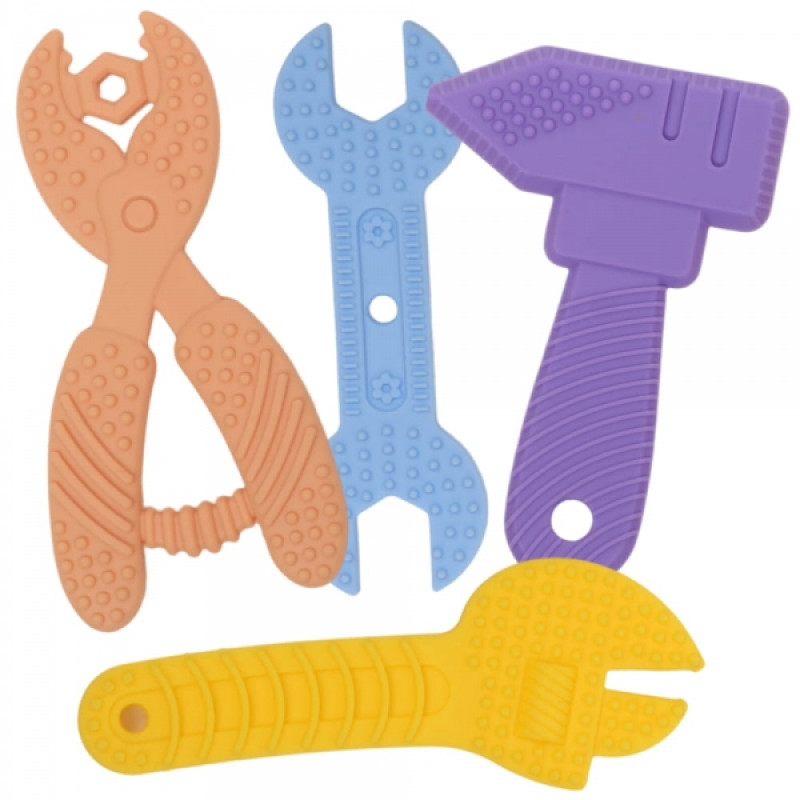 Silikónové hryzátka v tvare náradia – zábava a úľava pri prerezávaní zúbkov.