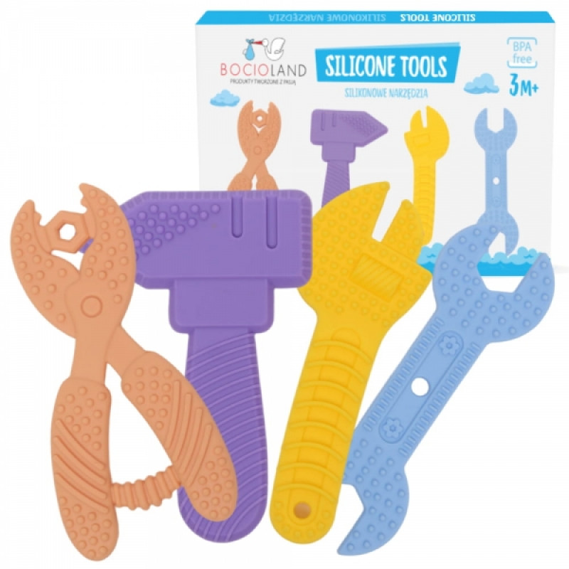 Bezpečné silikónové hračky v tvare náradia zaujmú a zároveň pomáhajú pri raste zúbkov.